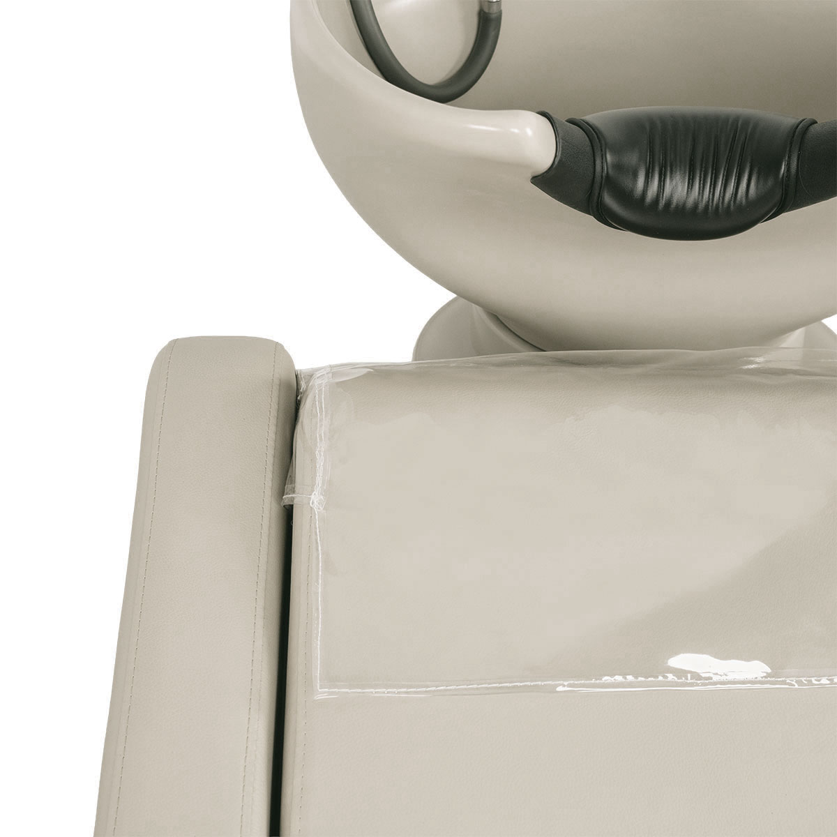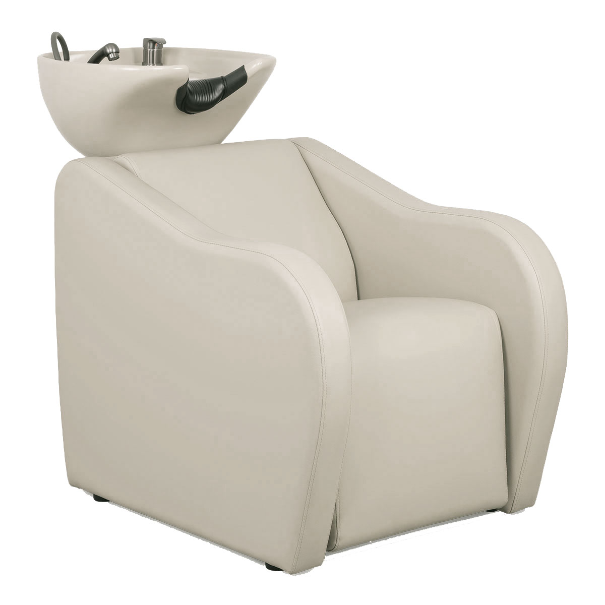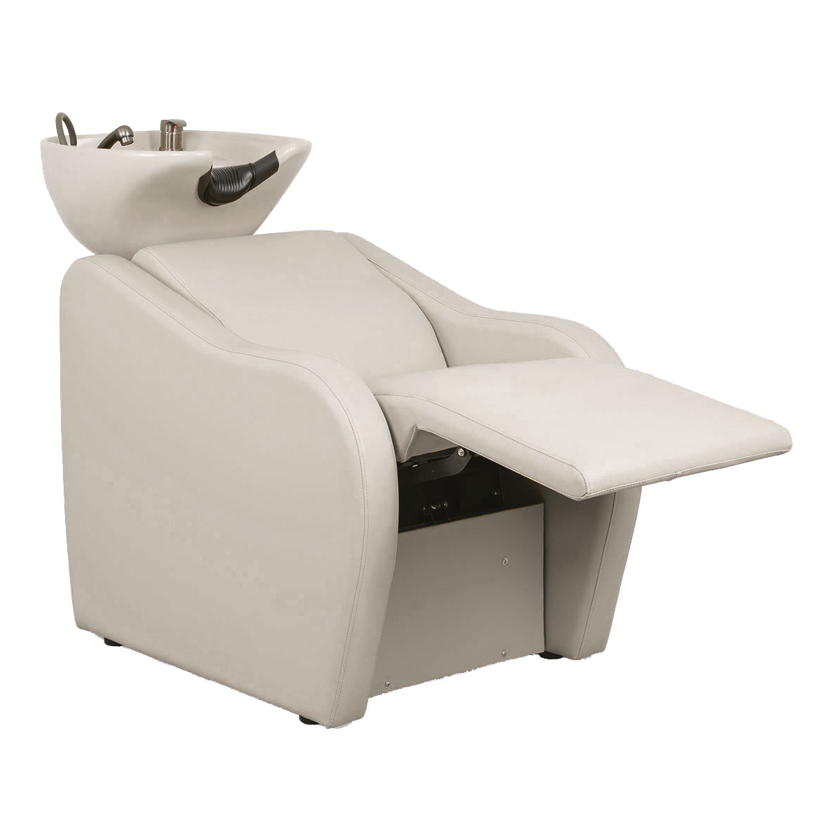 Bac de lavage VELARIS BE + MASSAGE , repose jambes électrique réglable en position allongée, finition en similicuir beige avec vasque en céramique équipée, blanche, beige ou noire.