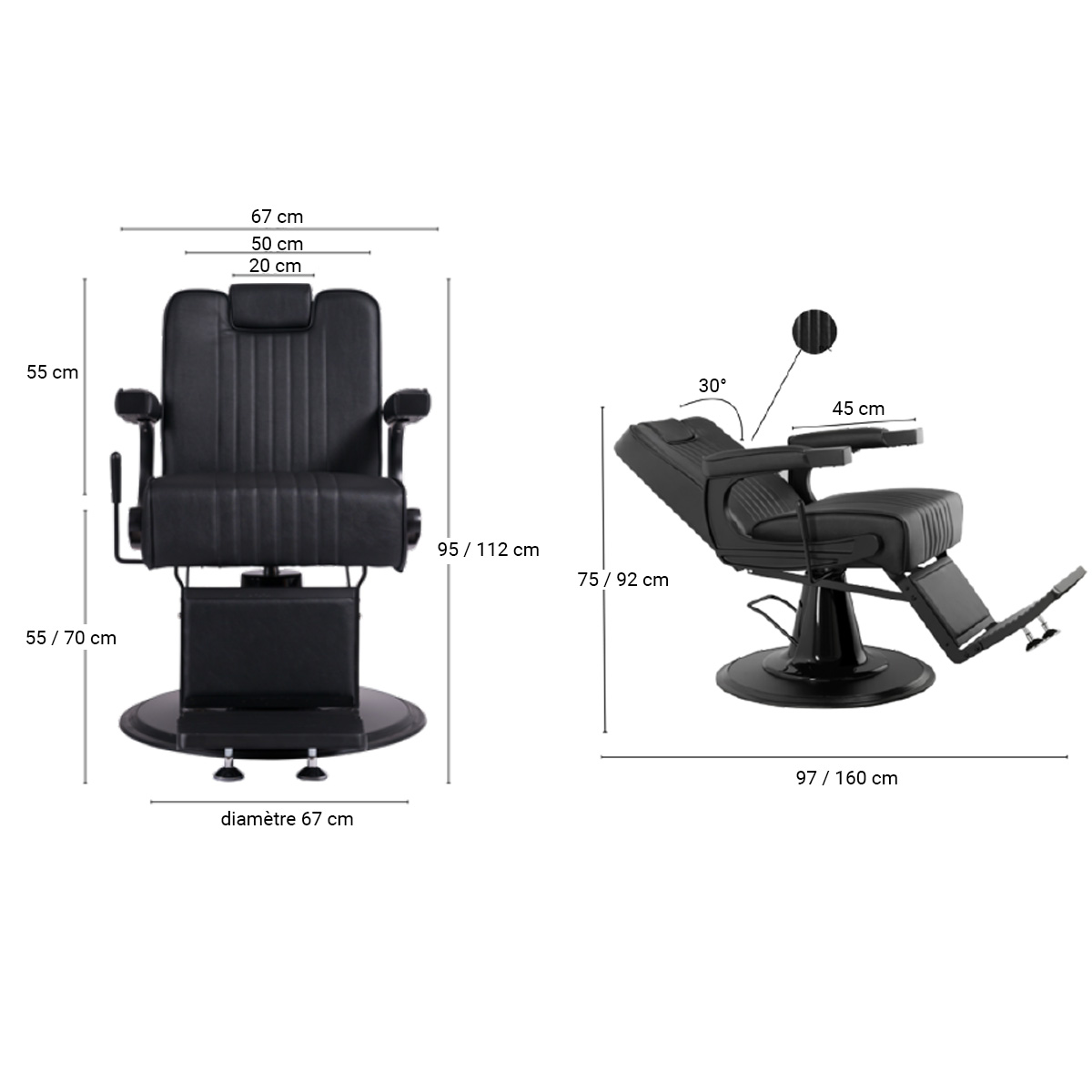 Fauteuil barbier ANDY BARBER structure en fonte d’aluminium noir mat + rembourrage en mousse haute densité + revêtement en skaï couleur noir + pompe hydraulique + appuie-tête réglable + repose-pieds