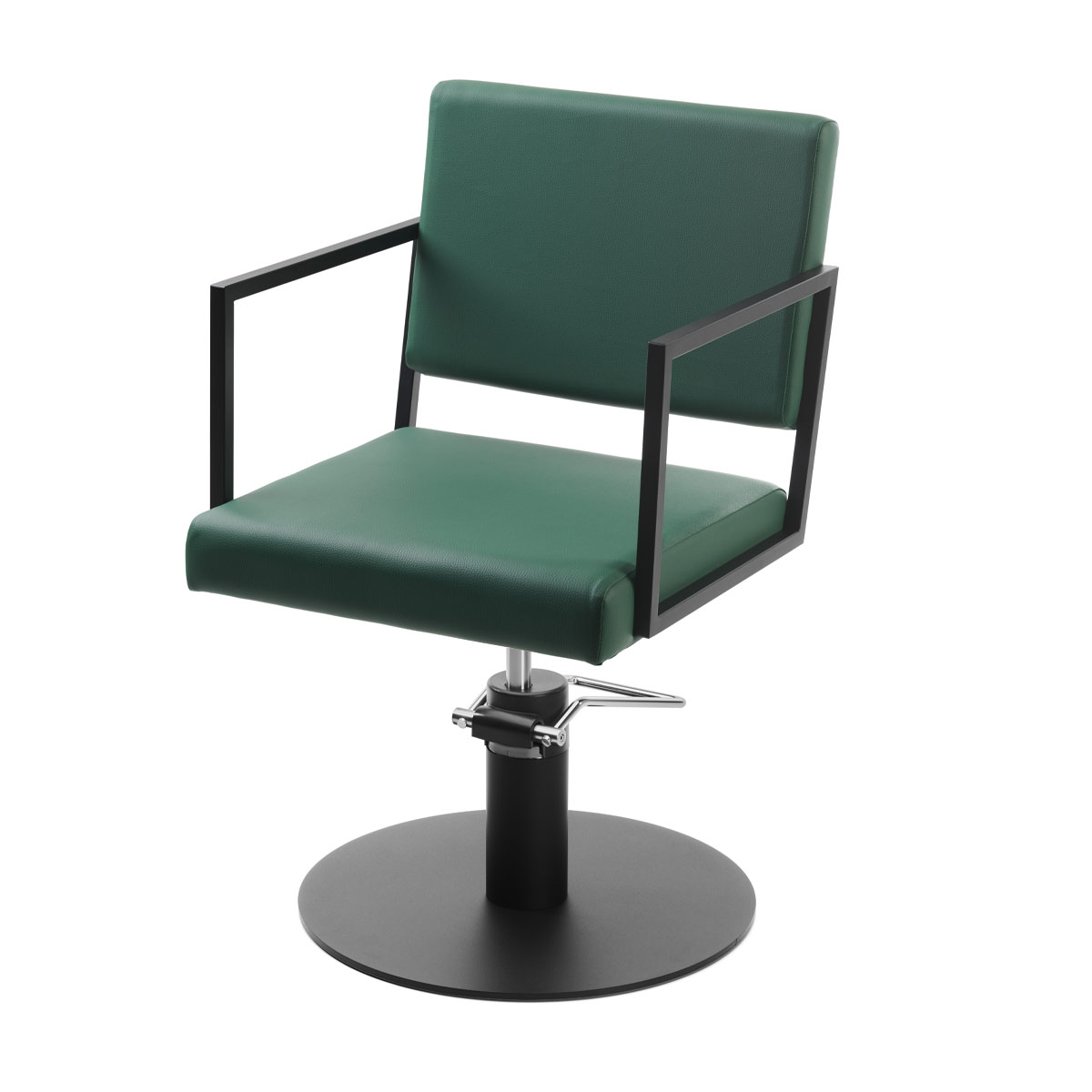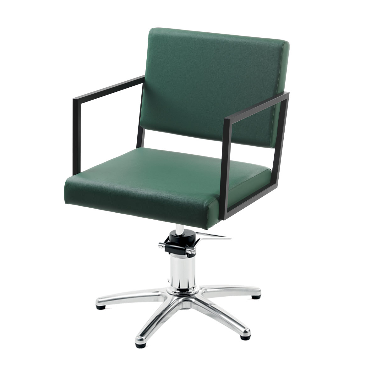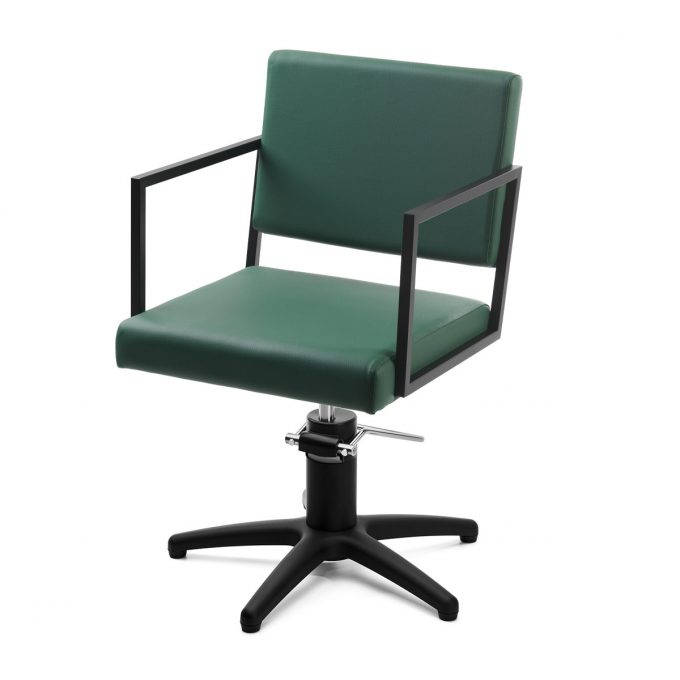 Fauteuil de coiffure BELMO, structure en aluminium brillant et siège recouvert d’une tapisserie de skai.