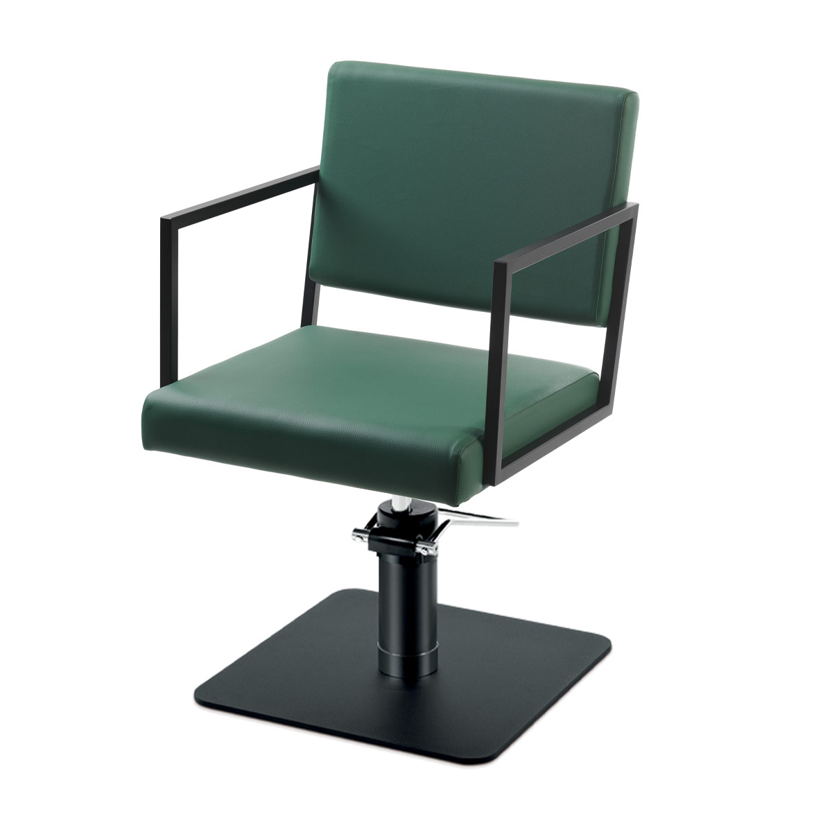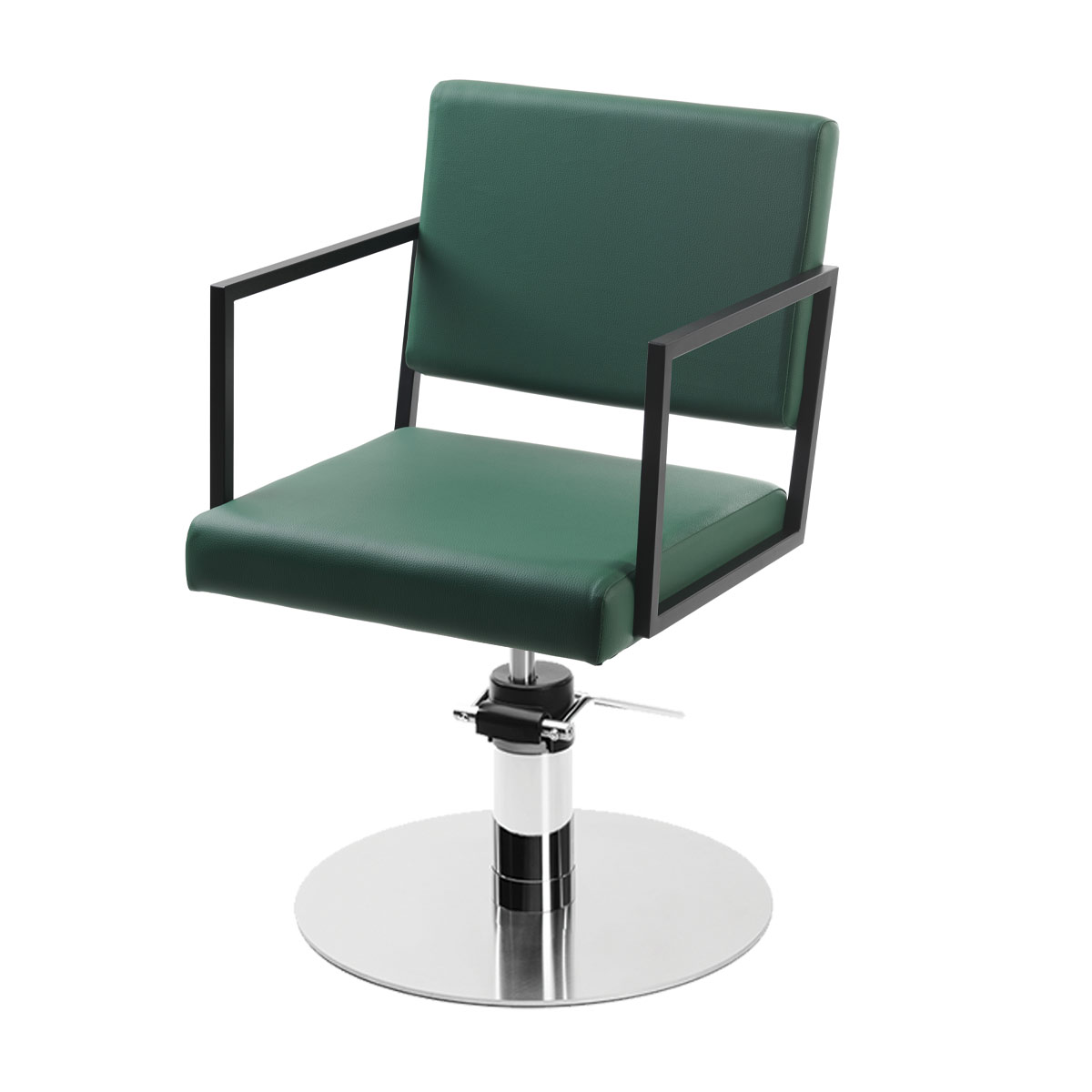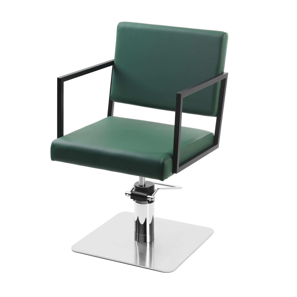 Fauteuil de coiffure BELMO, structure en aluminium brillant et siège recouvert d’une tapisserie de skai.