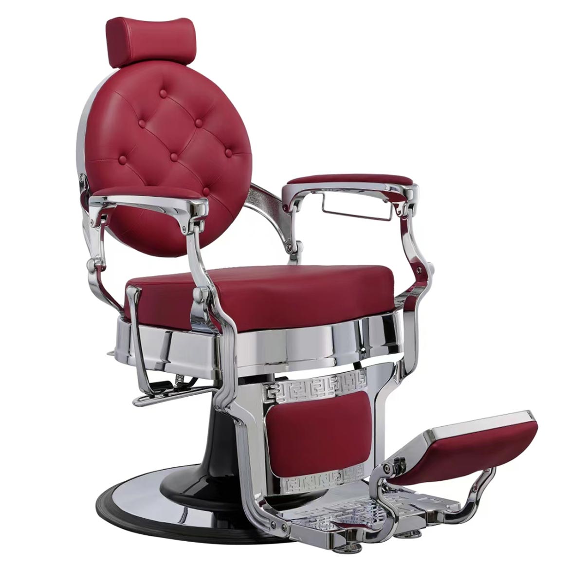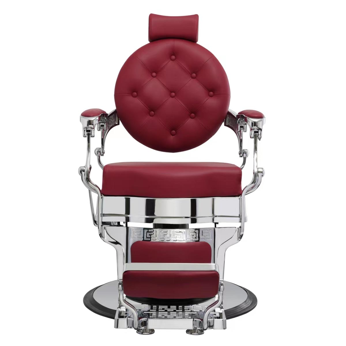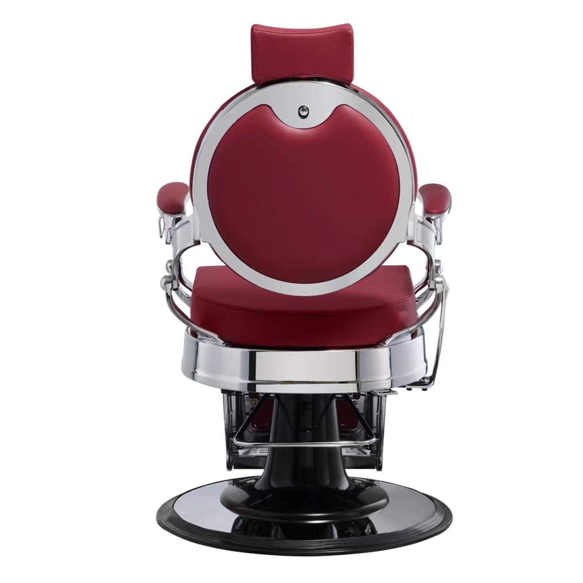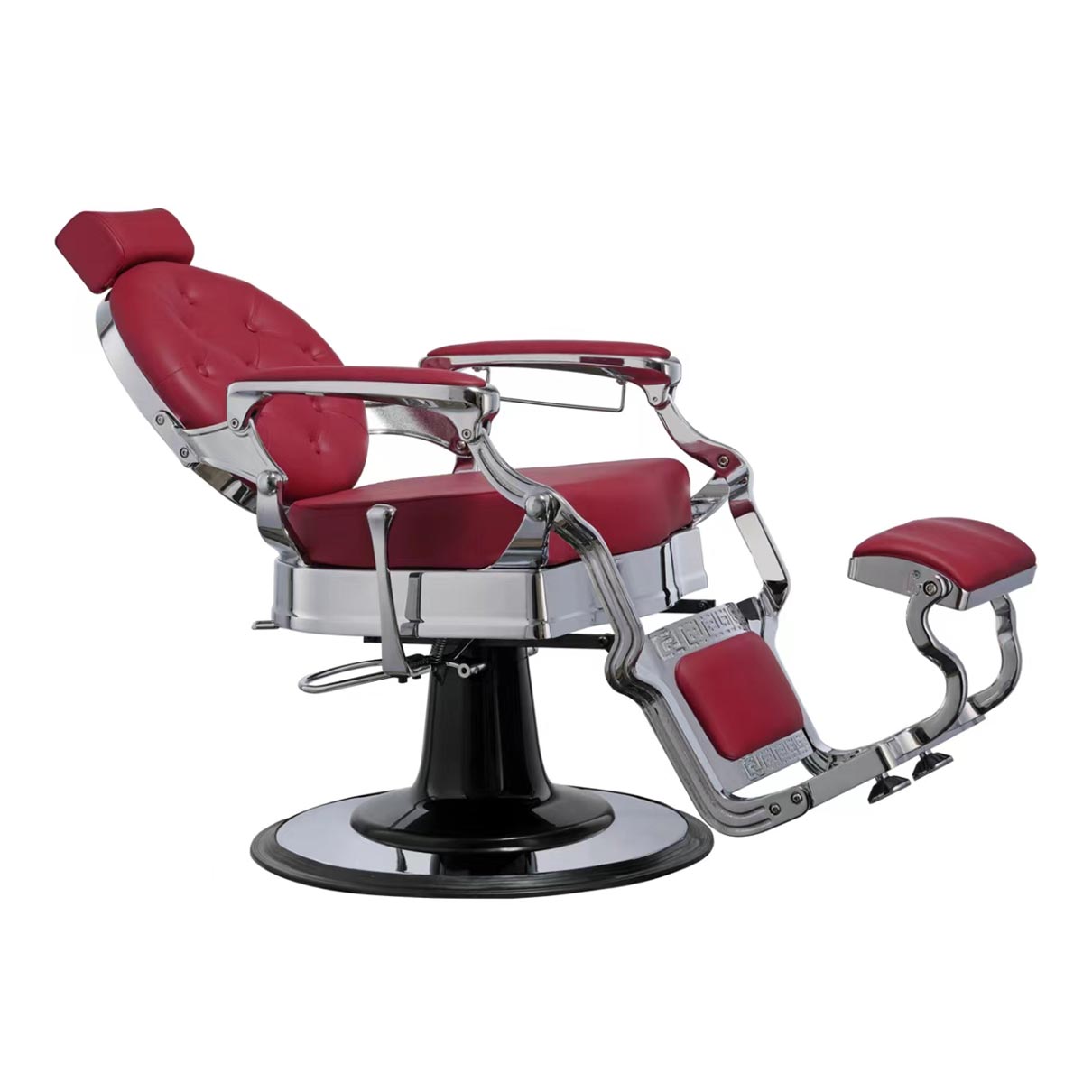 Fauteuil barbier COOPER RED, structure en métal avec finitions chromés, un siège en mousse de haute densité avec une tapisserie en skaï rouge bordeaux. Pompe hydraulique et un dossier réglable. Appuie-tête ajustable et repose-pieds et jambes réglables.