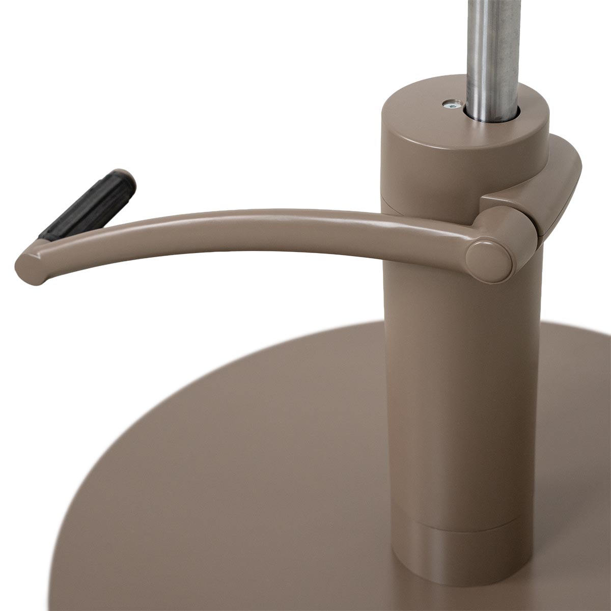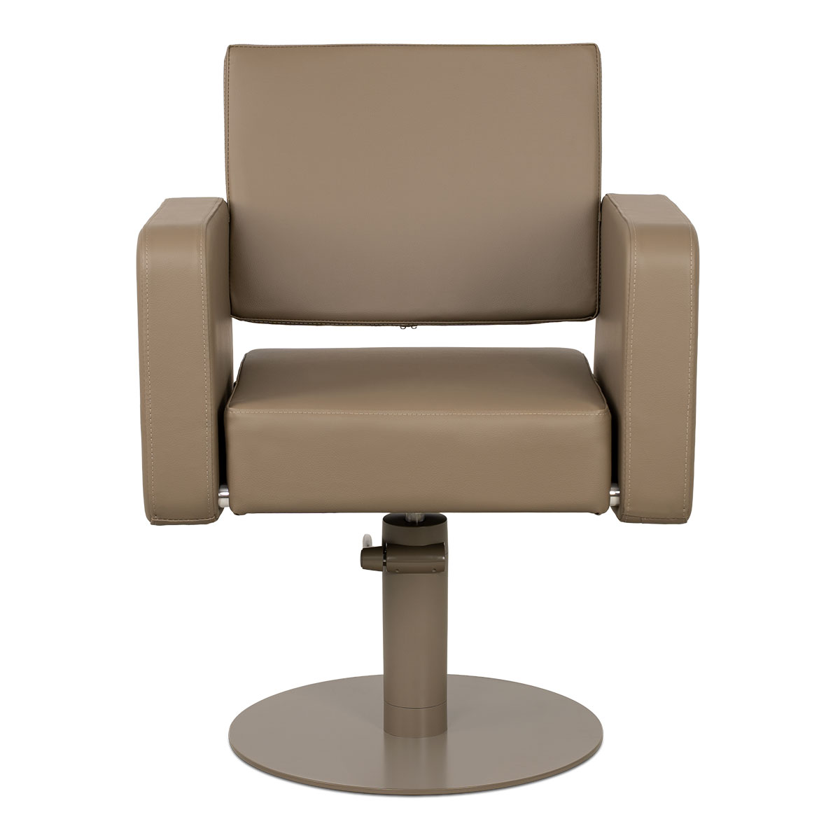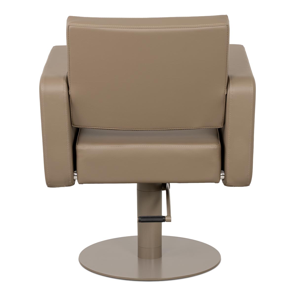 Fauteuil de coiffure FLIRTY MARRON, base ronde avec pompe hydraulique + siège rembourré tapissé en similicuir, intégralement marron, avec espaces entre les accoudoirs évitant l’accumulation des cheveux