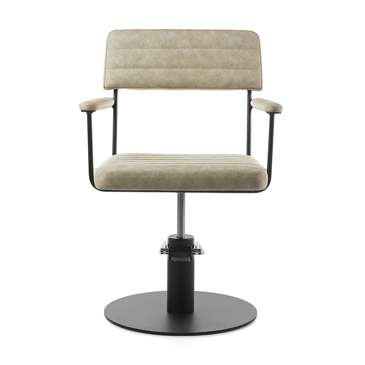 Fauteuil de coiffure LEA, assise en mousse haute densité avec accoudoirs en métal noir tapissés d’un revêtement en similicuir sur une base avec pompe hydraulique. Plusieurs finitions et bases aux choix.