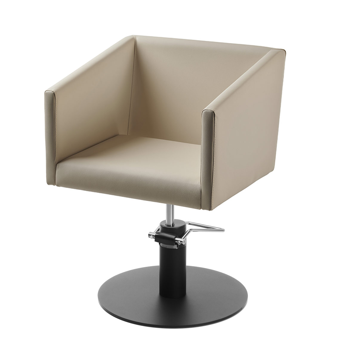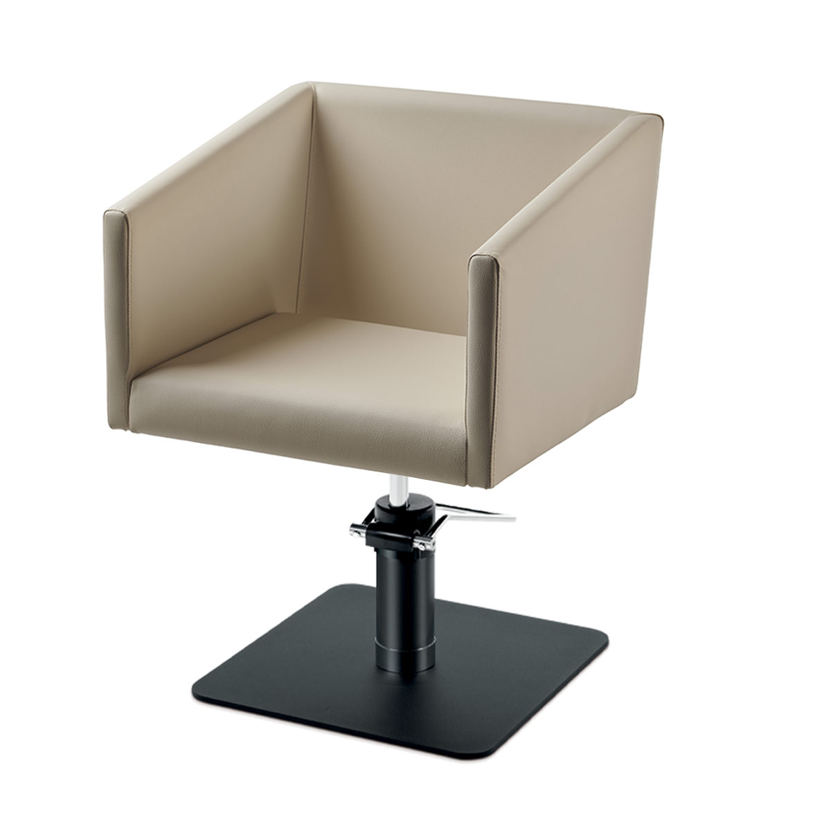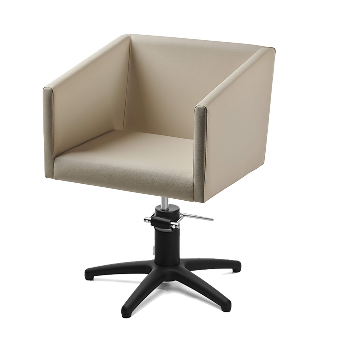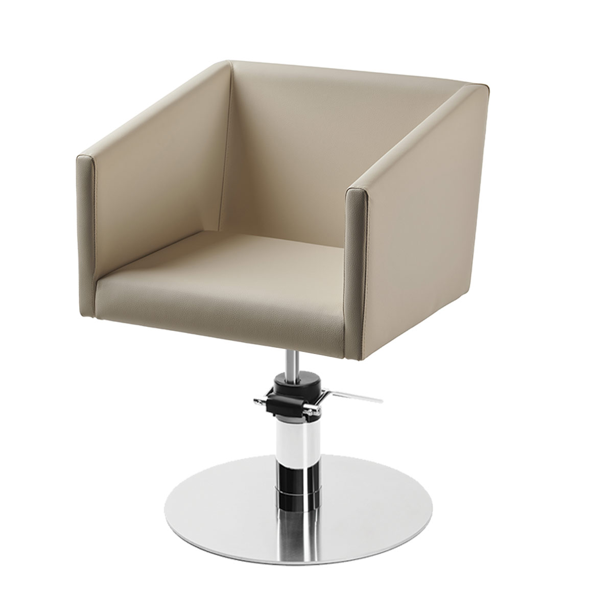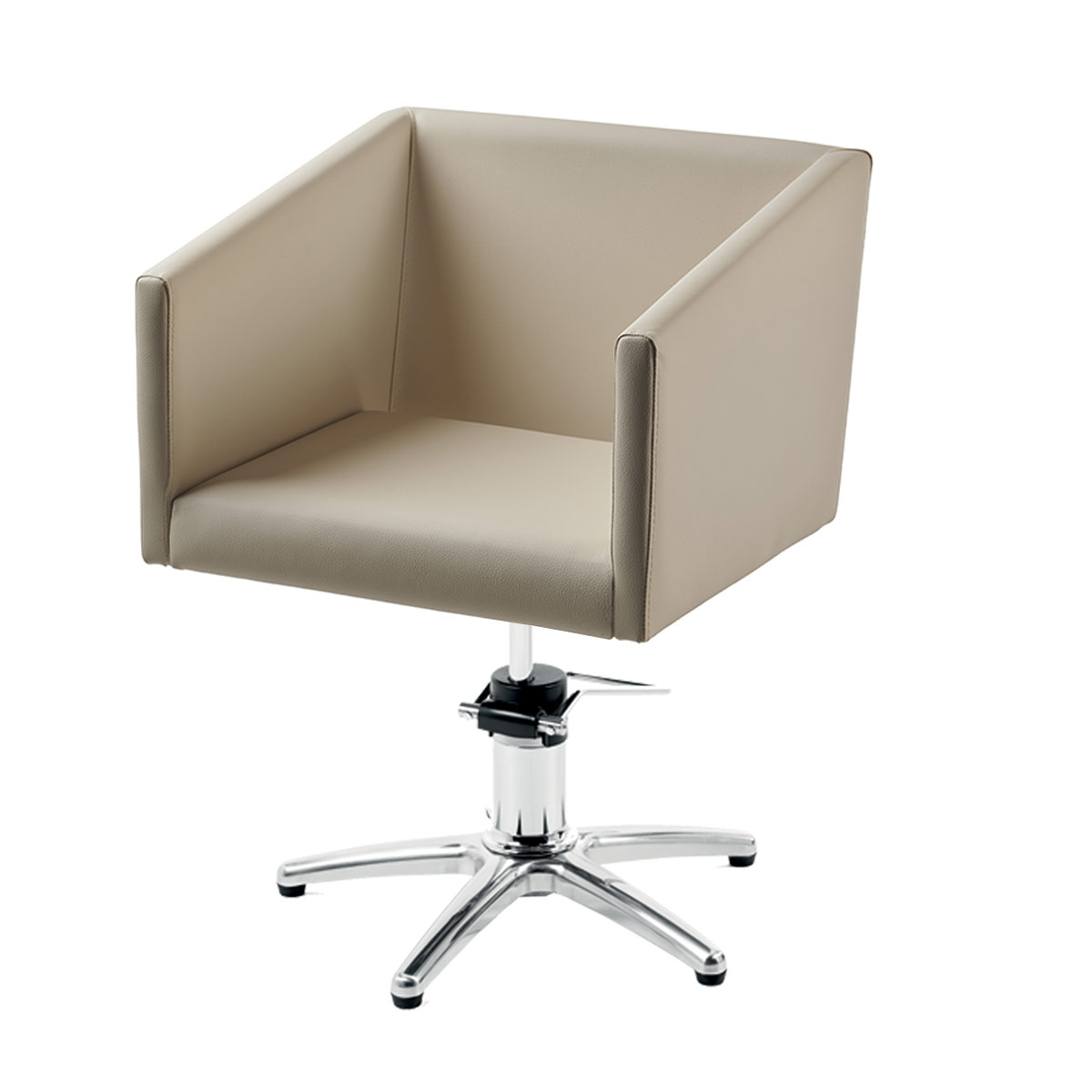 Fauteuil de coiffage LIRONE, structure en aluminium brillant avec pompe hydraulique et recouvert d’une tapisserie de skai.