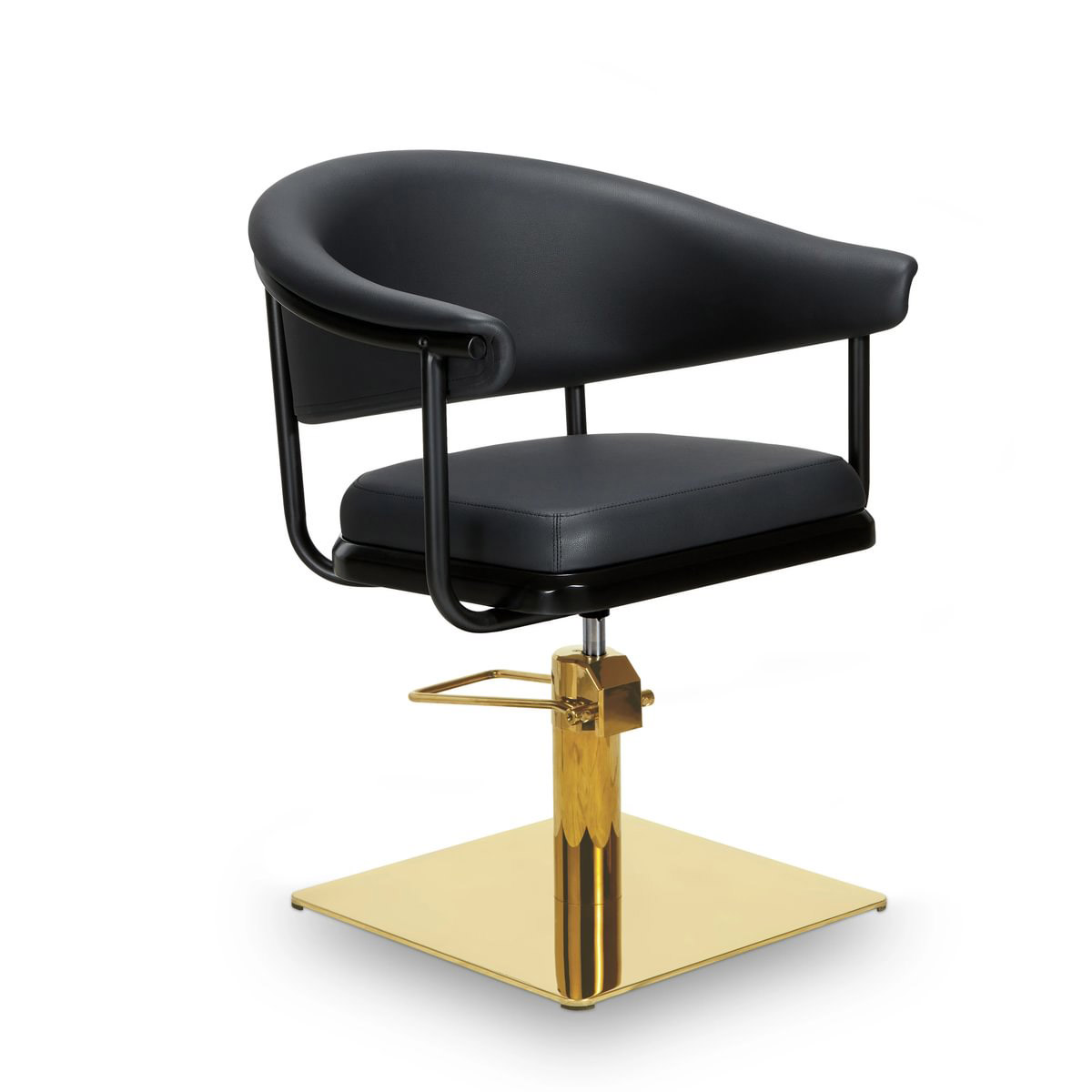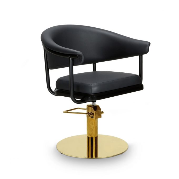 Fauteuil de coiffage LYRA B-G, finition en similicuir noir (B)ou autres coloris en options, bases aux choix ronde ou carré dorée avec pompes hydrauliques incluses.