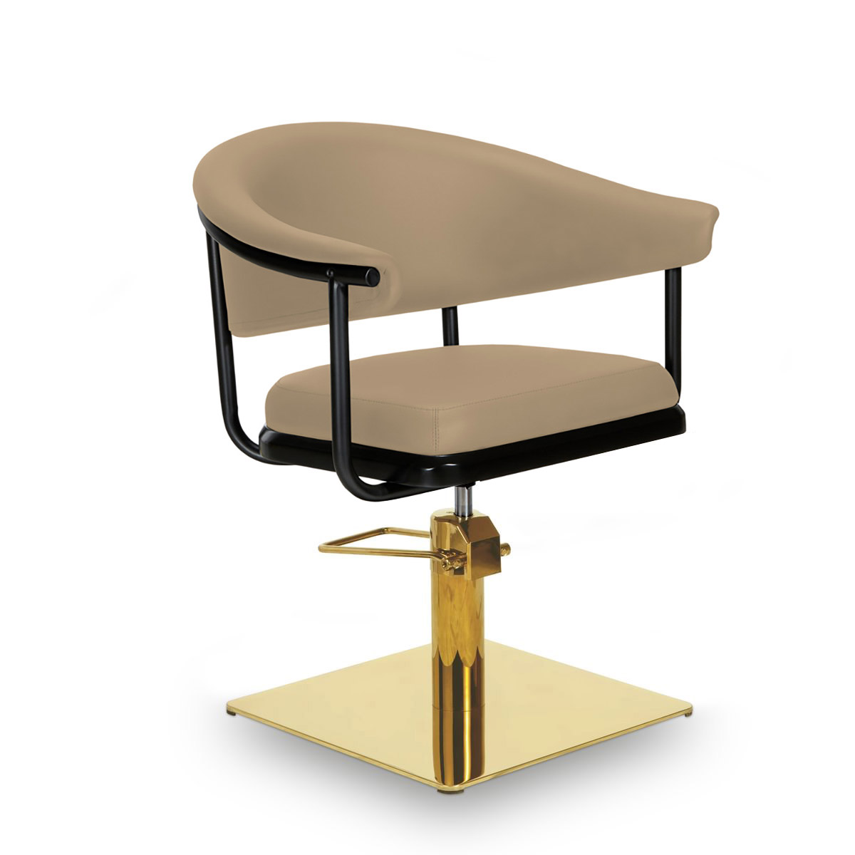 Fauteuil de coiffage LYRA BE-G, finition en similicuir beige (BE)ou autres coloris en options, bases aux choix ronde ou carré dorée avec pompes hydrauliques incluses.