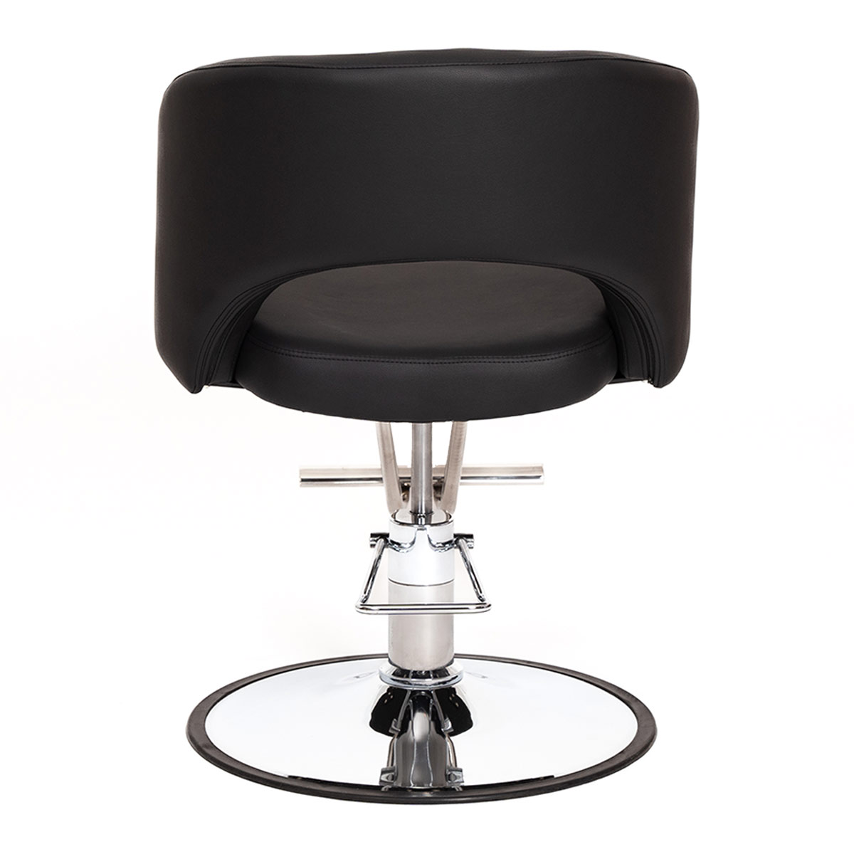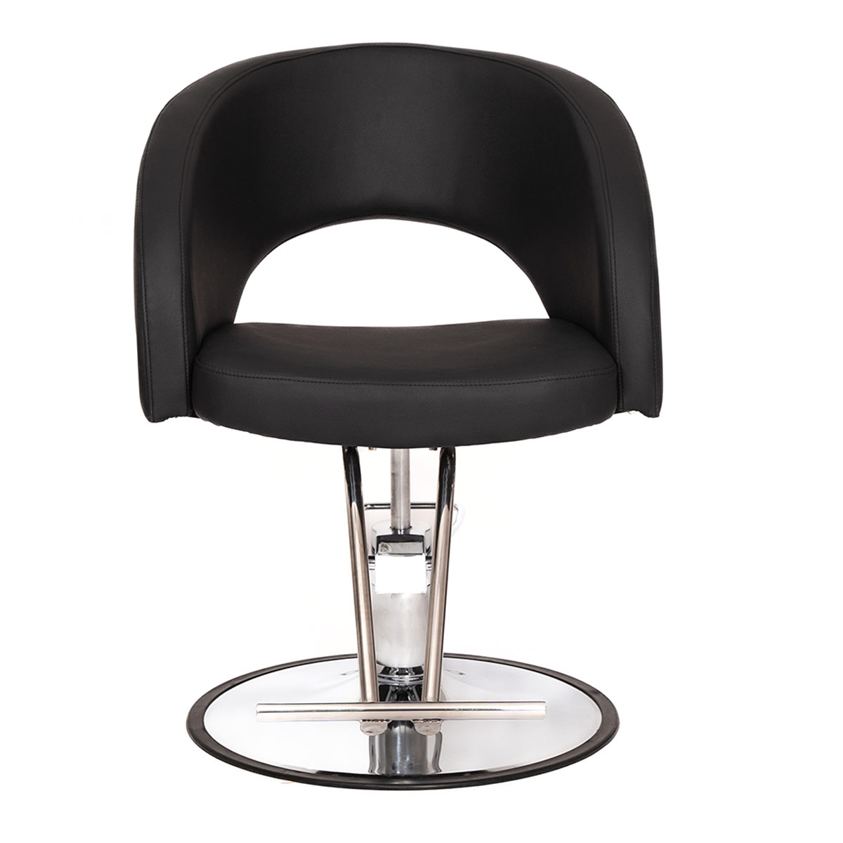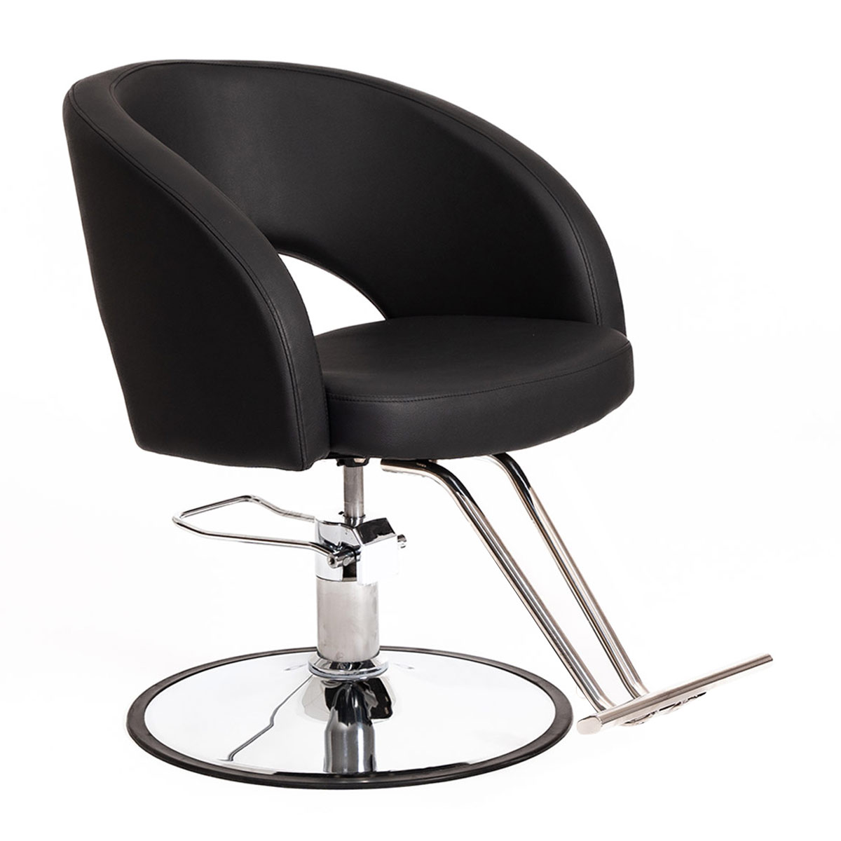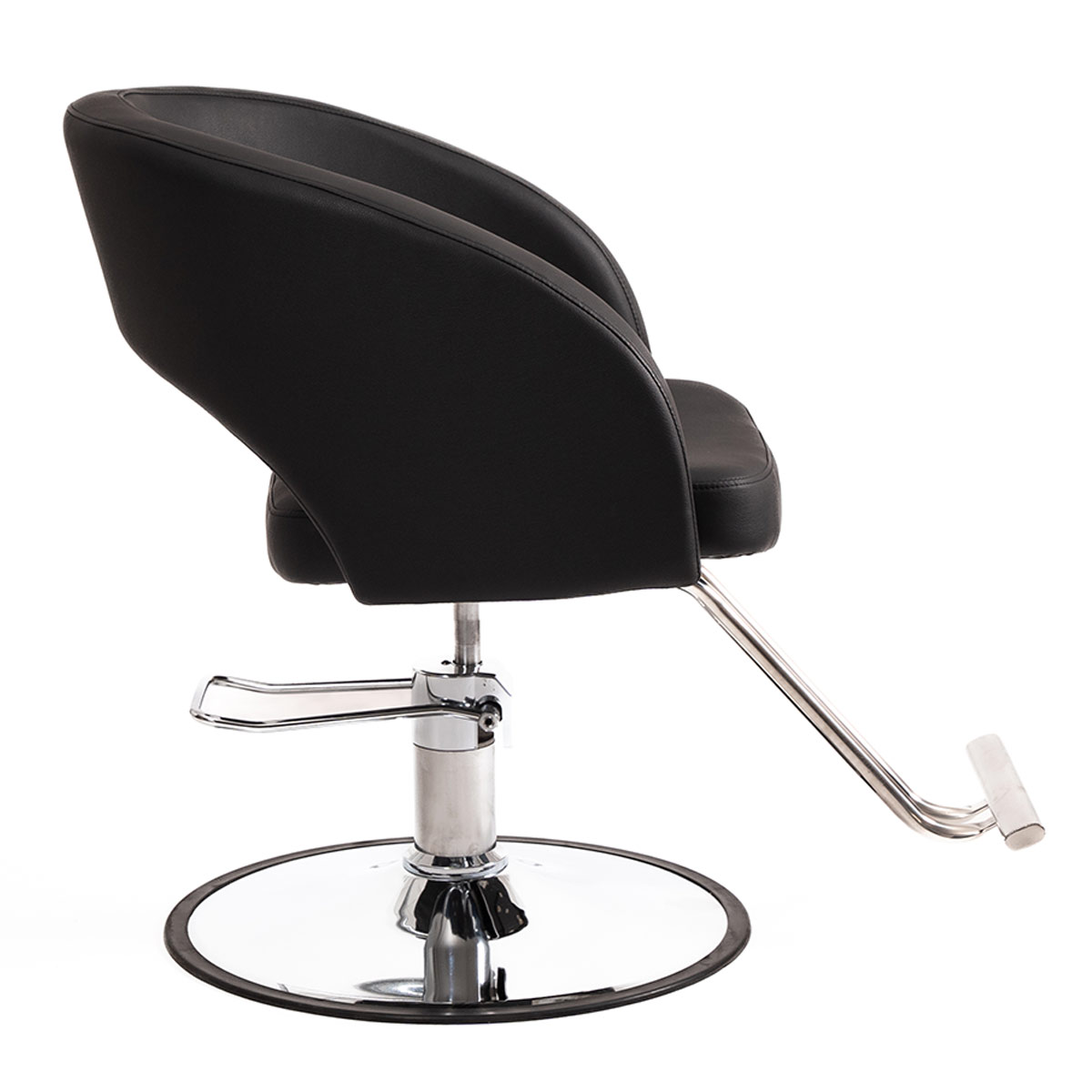 Fauteuil de coiffure SARAH, avec base ronde chromée + pompe hydraulique, structure en aluminium brillant et recouvert d’une tapisserie de skaï noir + un repose pieds intégré pour plus de confort.