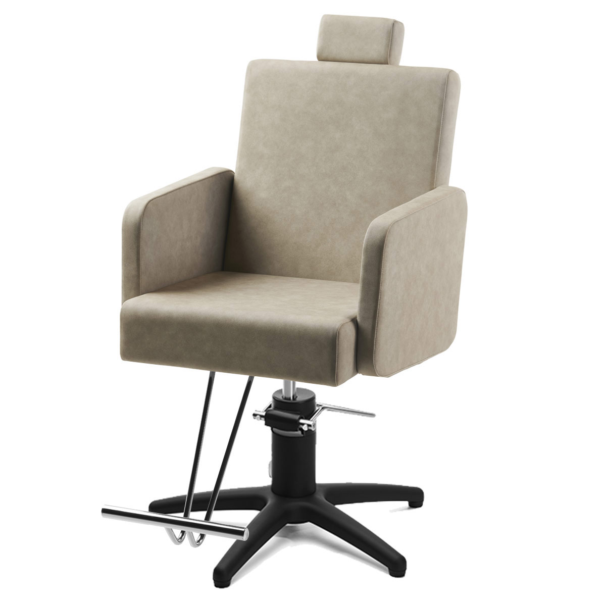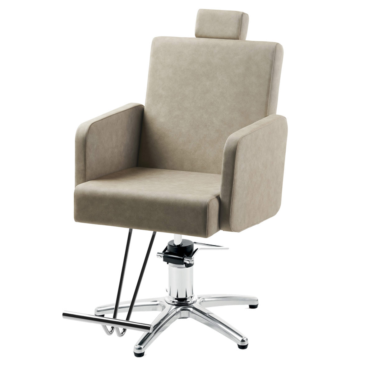 Fauteuil barbier TAIKI, avec repose-pieds et appuie-tête réglable, il brille par sa simplicité, grâce à sa structure en métal brillant avec piètement carré ou étoile et textile en similicuir (couleurs au choix), son dossier est inclinable à 40%, idéal pour un salon de barbier.