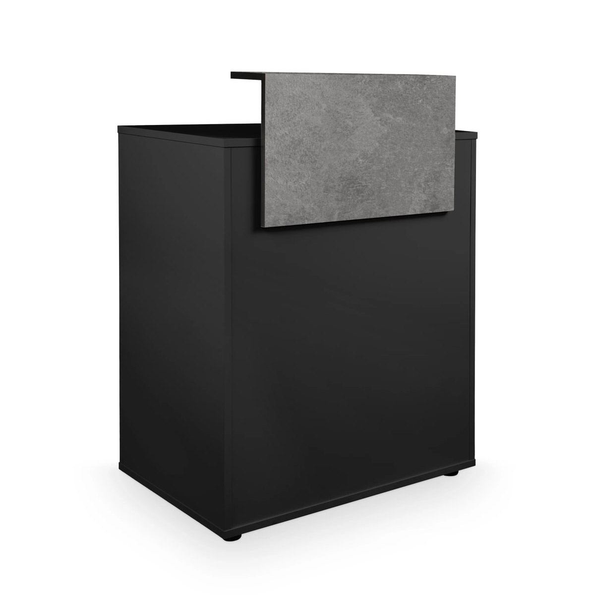 La réception DYLAN DESK est un meuble en bois stratifié + comptoir effet béton ciré gris résistant aux rayures + une tablette extractible pour clavier + deux étagères + un tiroir caisse à serrure.