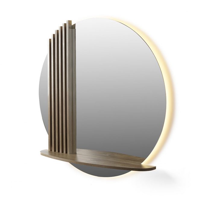 Poste de coiffage NEBU : grand miroir rond avec éclairage LED en option, structure décorative + tablette en stratifié, plusieurs choix de finition.