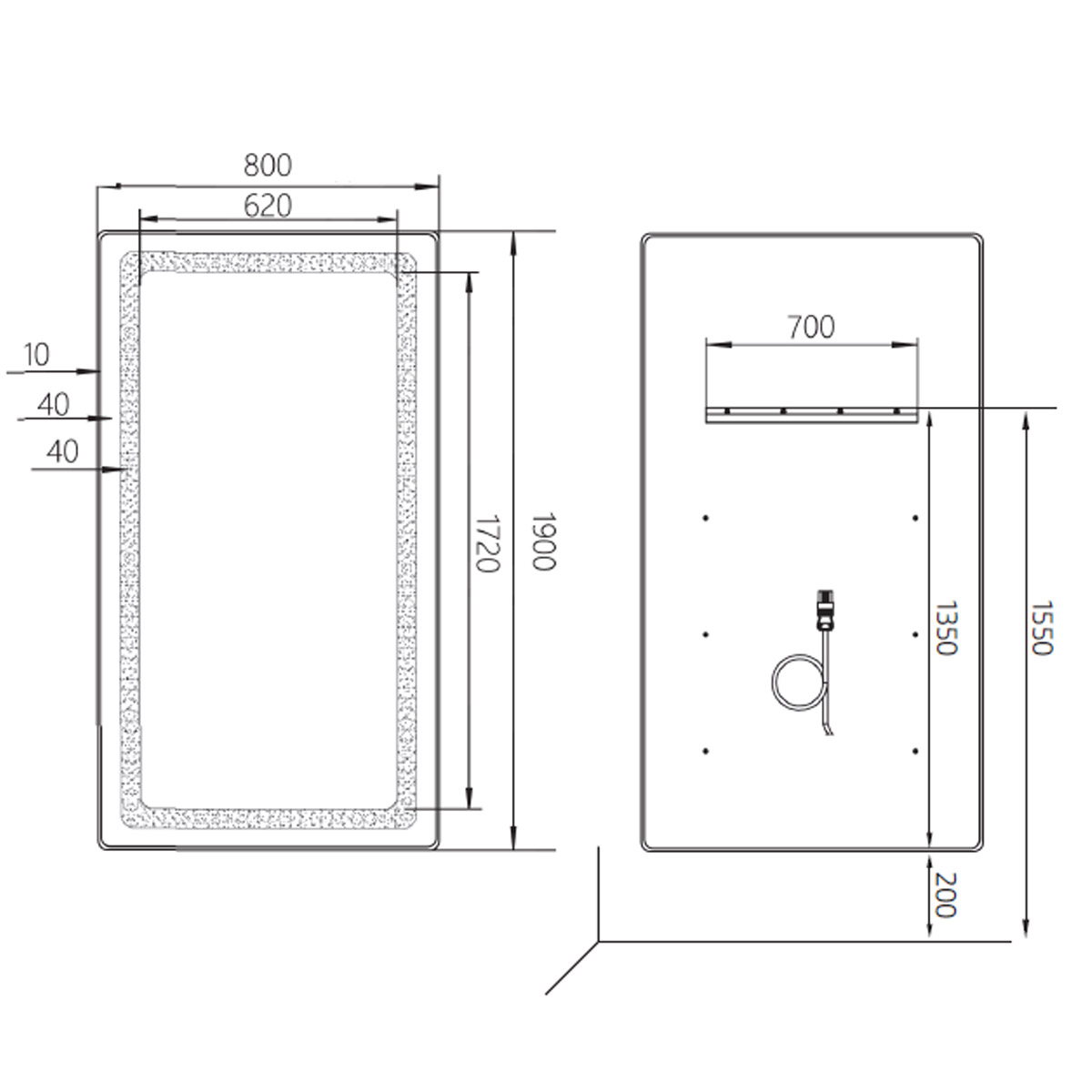 Miroir REC LED , hauteur 190 centimètres avec éclairage LED intégré sur son périmètre, couleur contour au choix, black, silver ou gold.