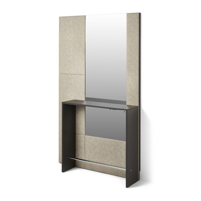 Poste de coiffage TORI : structure avec deux types de matériaux, tablette en stratifié et repose-pieds chromés.