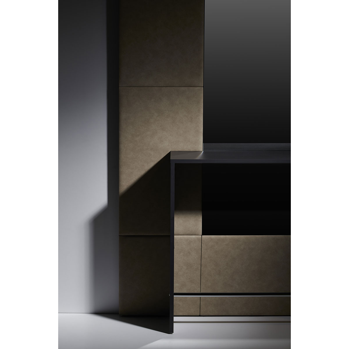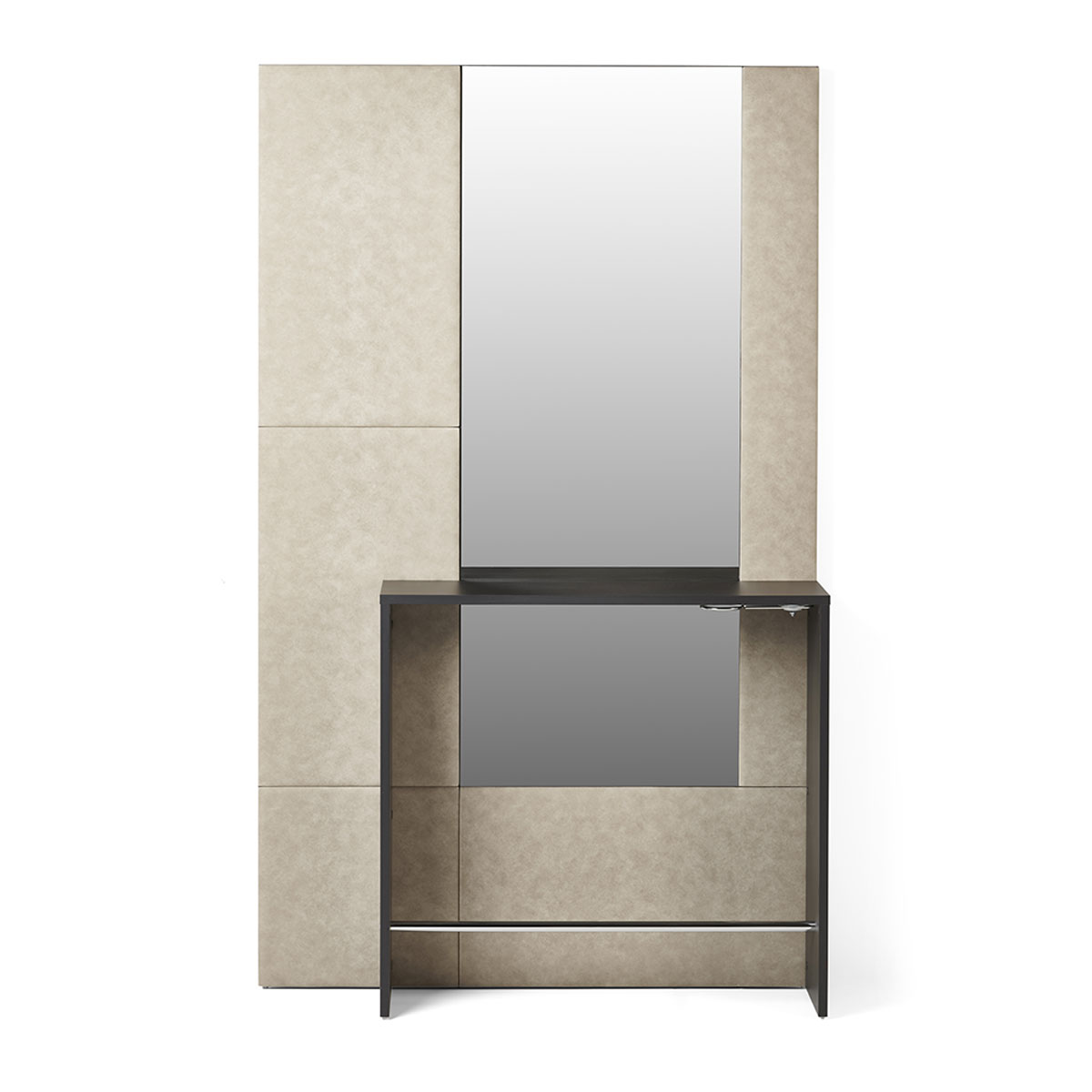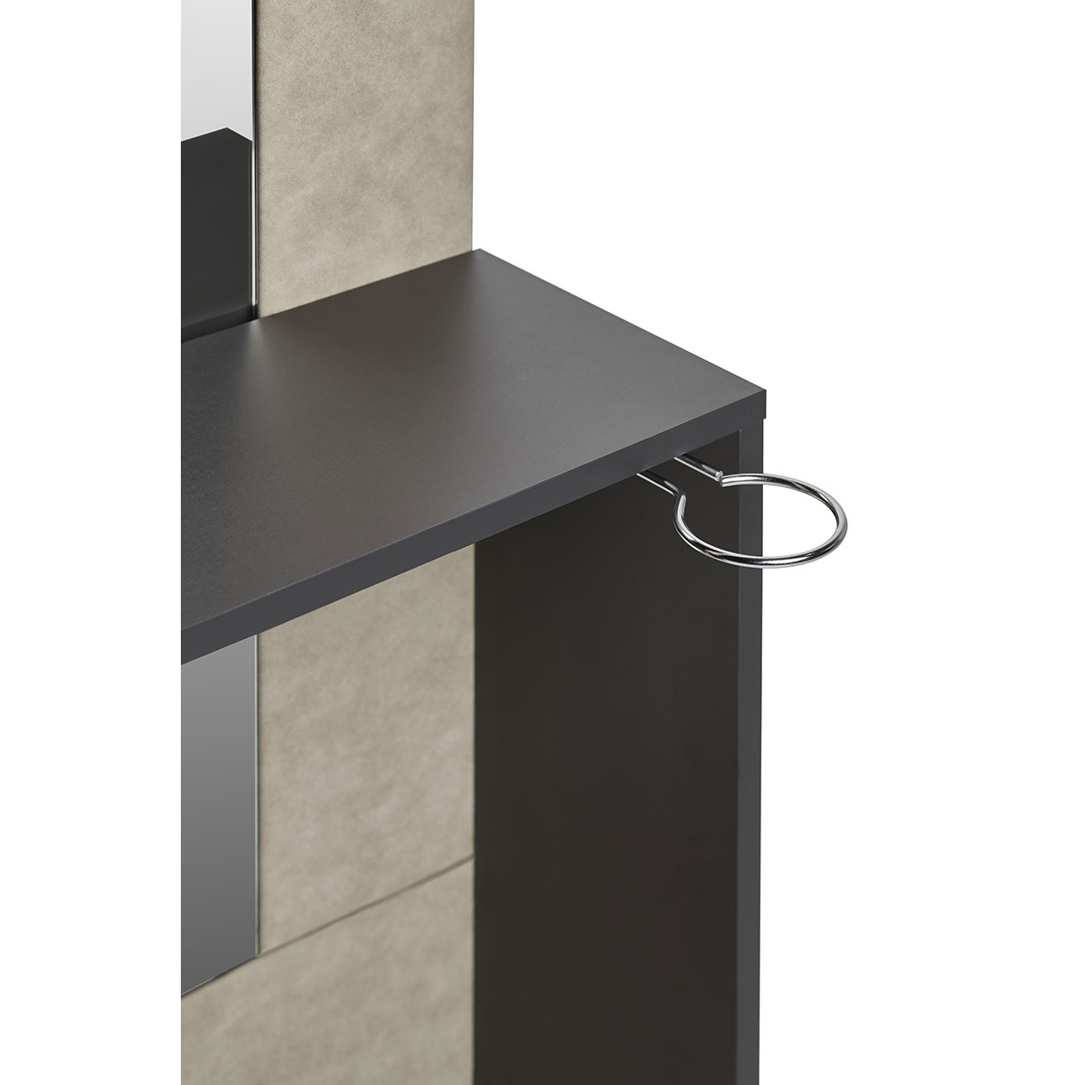 Poste de coiffage TORI : Structure avec deux types de matériaux, tablette en stratifié et repose-pieds chromés. Disponible avec option support séchoir.