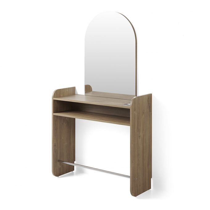 Poste de coiffage VICO 1S : Structure en stratifié, tablette avec rangements intégrés et repose-pieds chromé. Disponible avec options éclairages LED et prises électriques.