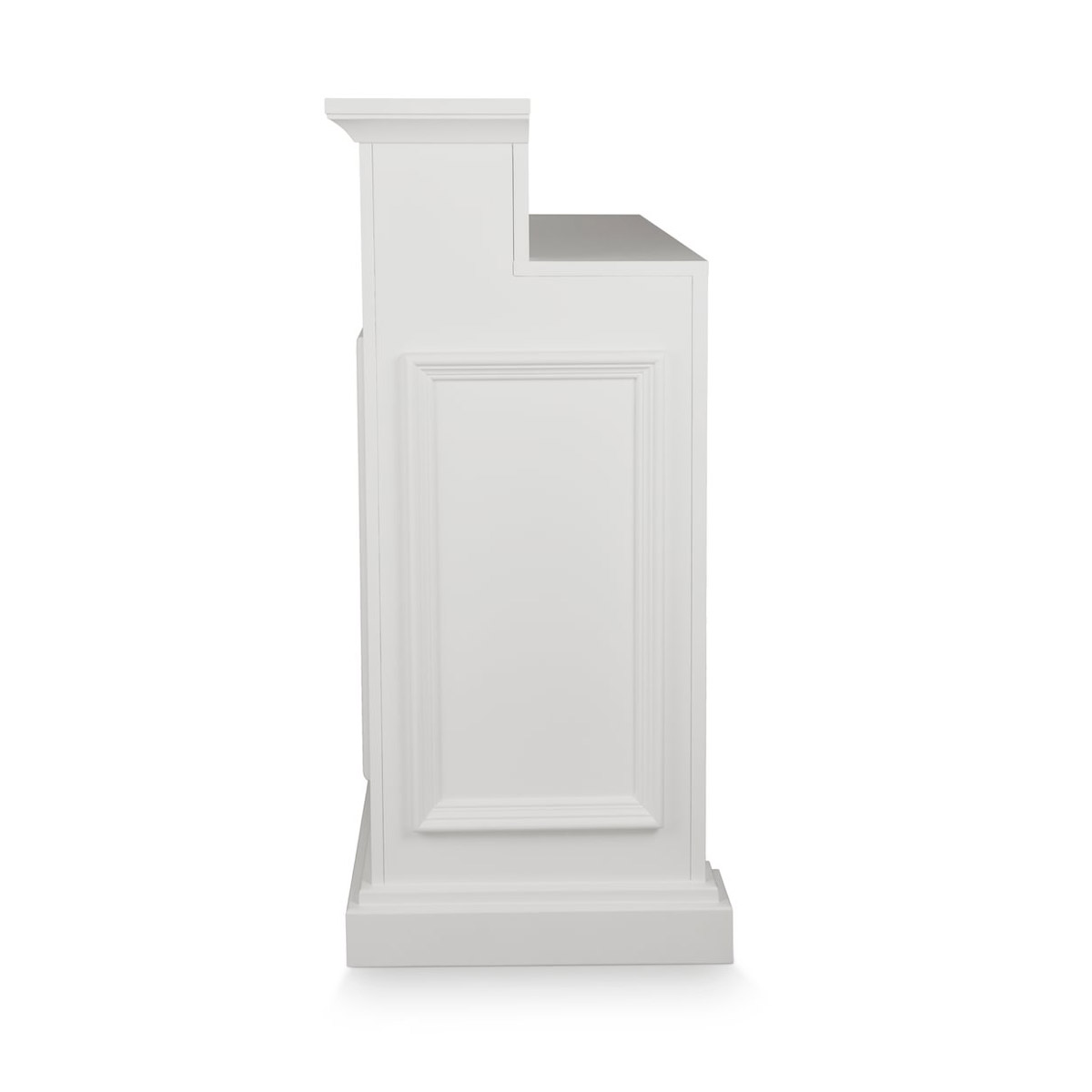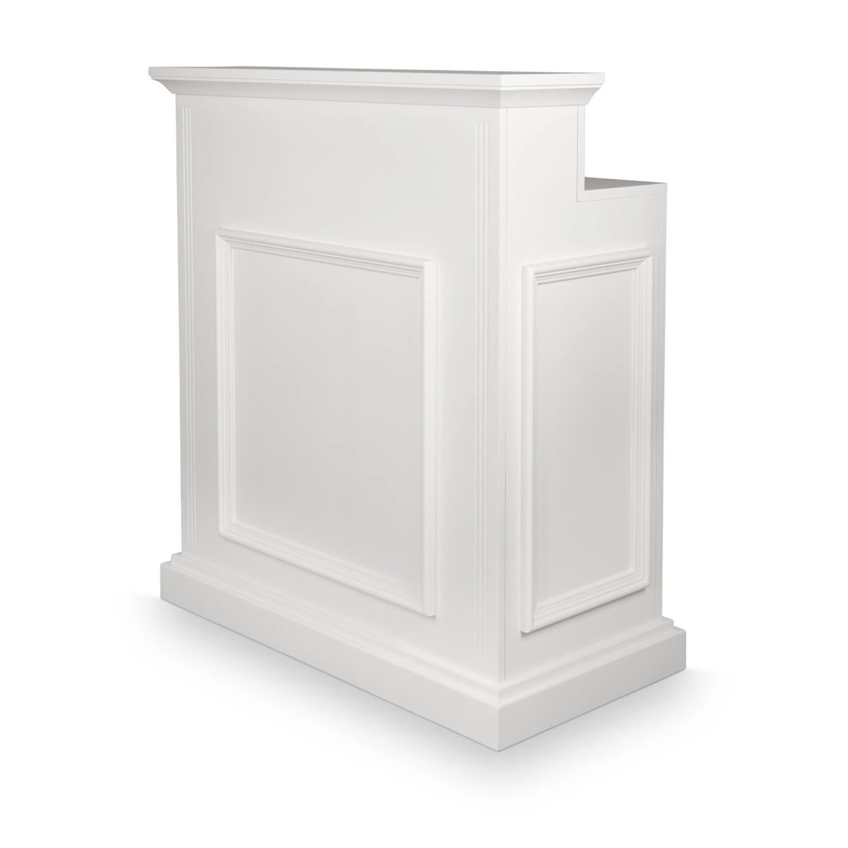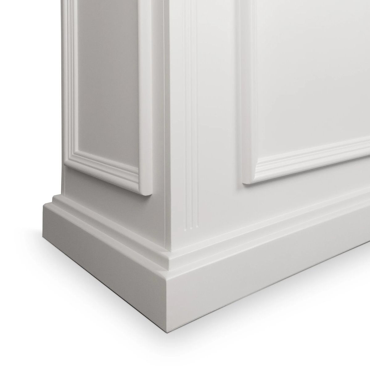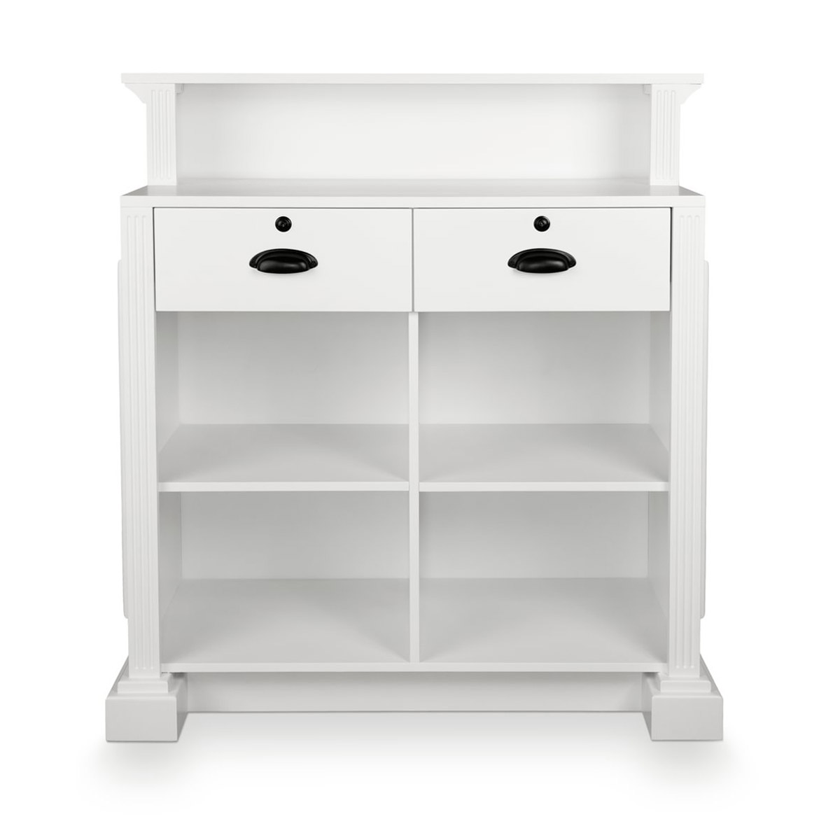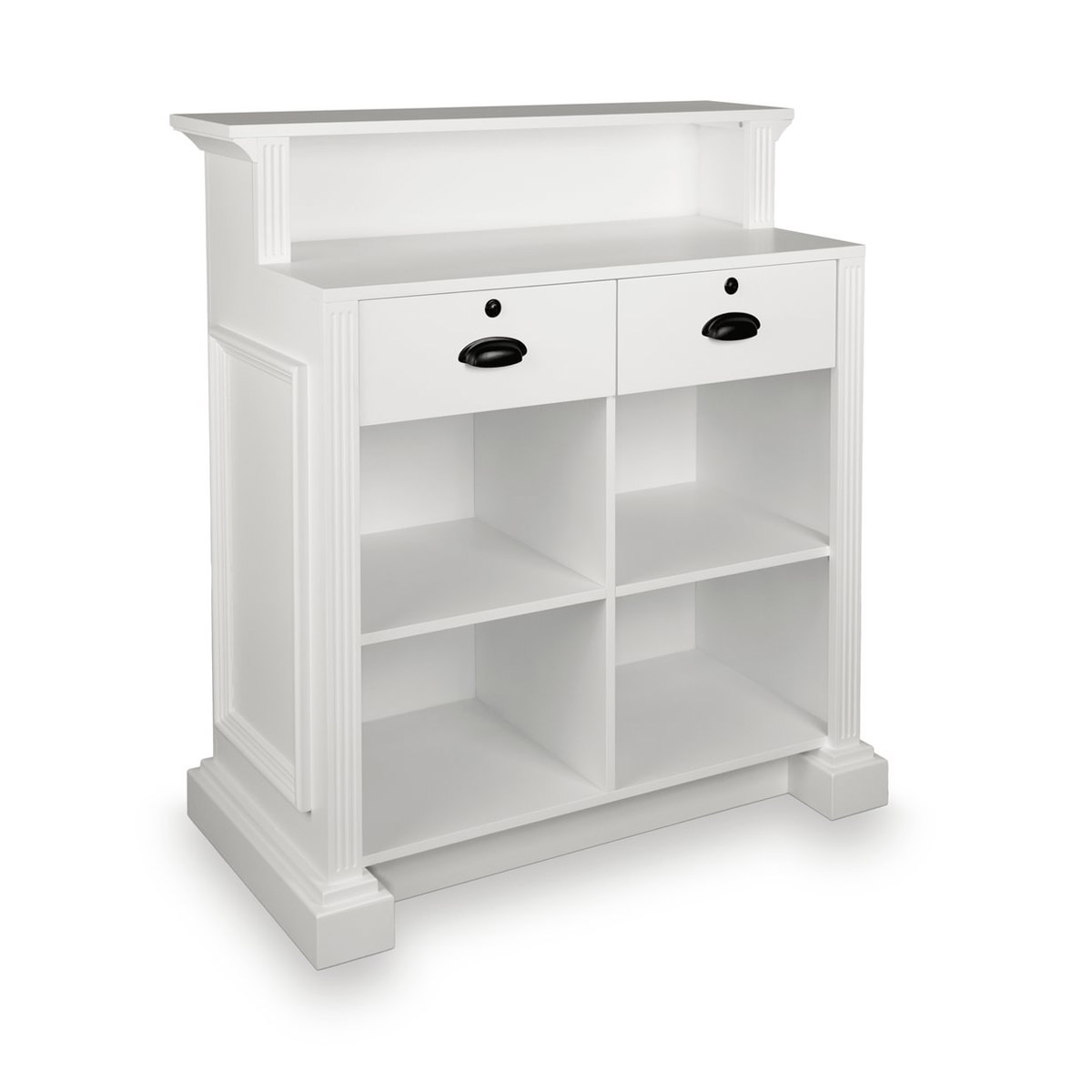 La réception EARL W meuble caisse en bois contreplaqué naturel avec moulures en bois massif vernis de blanc, rangements étagères et tiroirs à clés.
