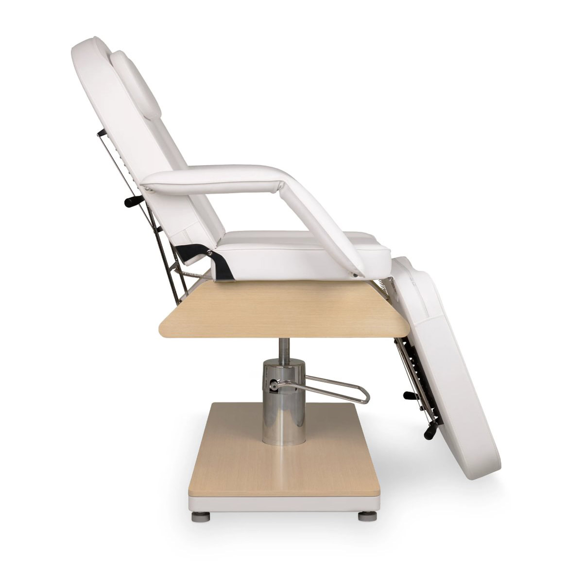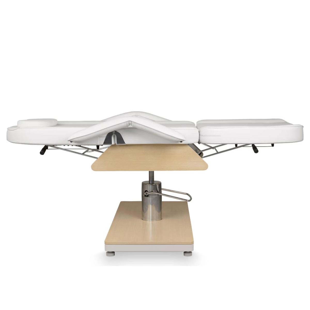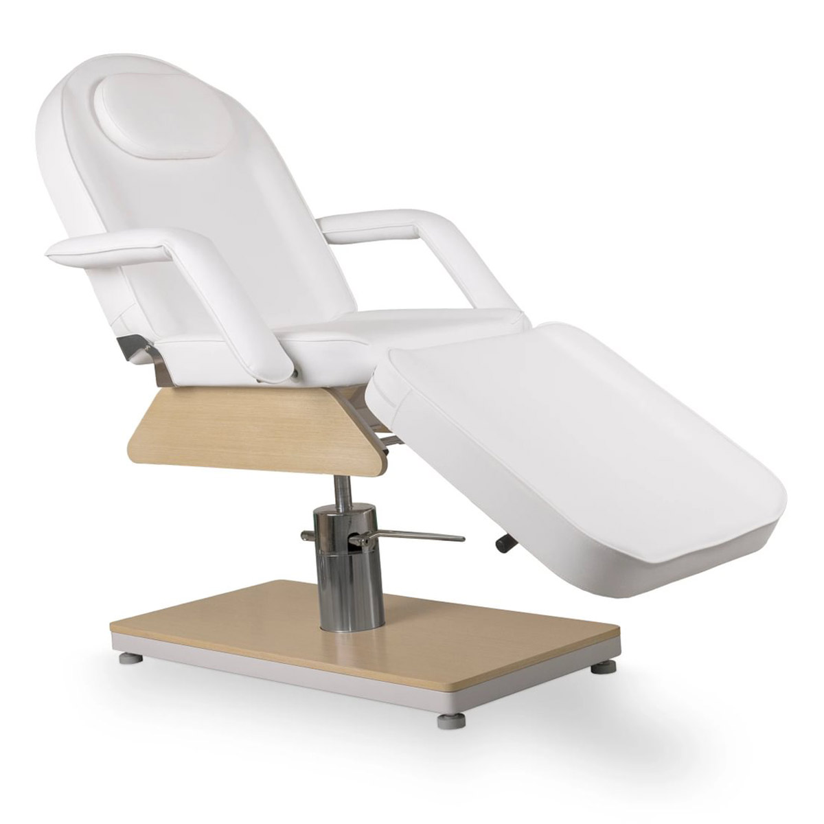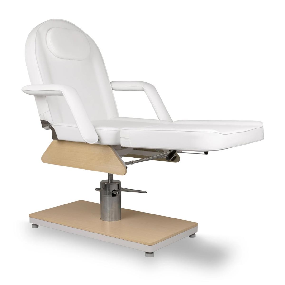 Fauteuil esthétique GEMINI W OAK, hauteur ajustable par système hydraulique, doté d’un dossier et d’un repose jambes modulables pour une installation entièrement horizontale. Conçu avec ouverture visage, il est parfaitement adapté aux soins et aux séances de bien-être.