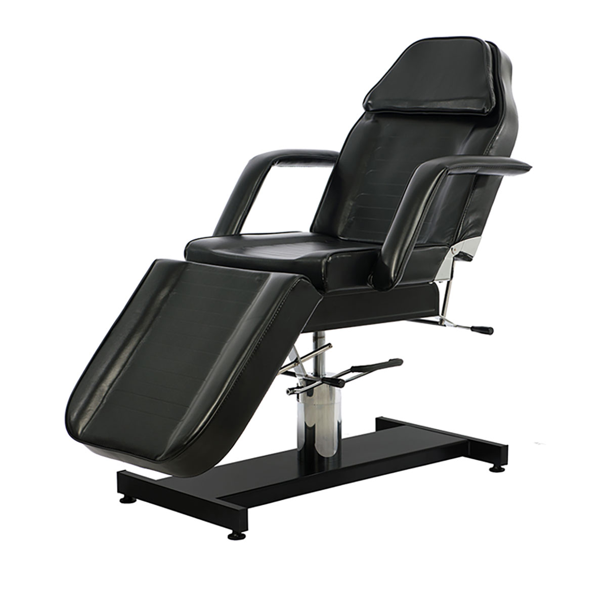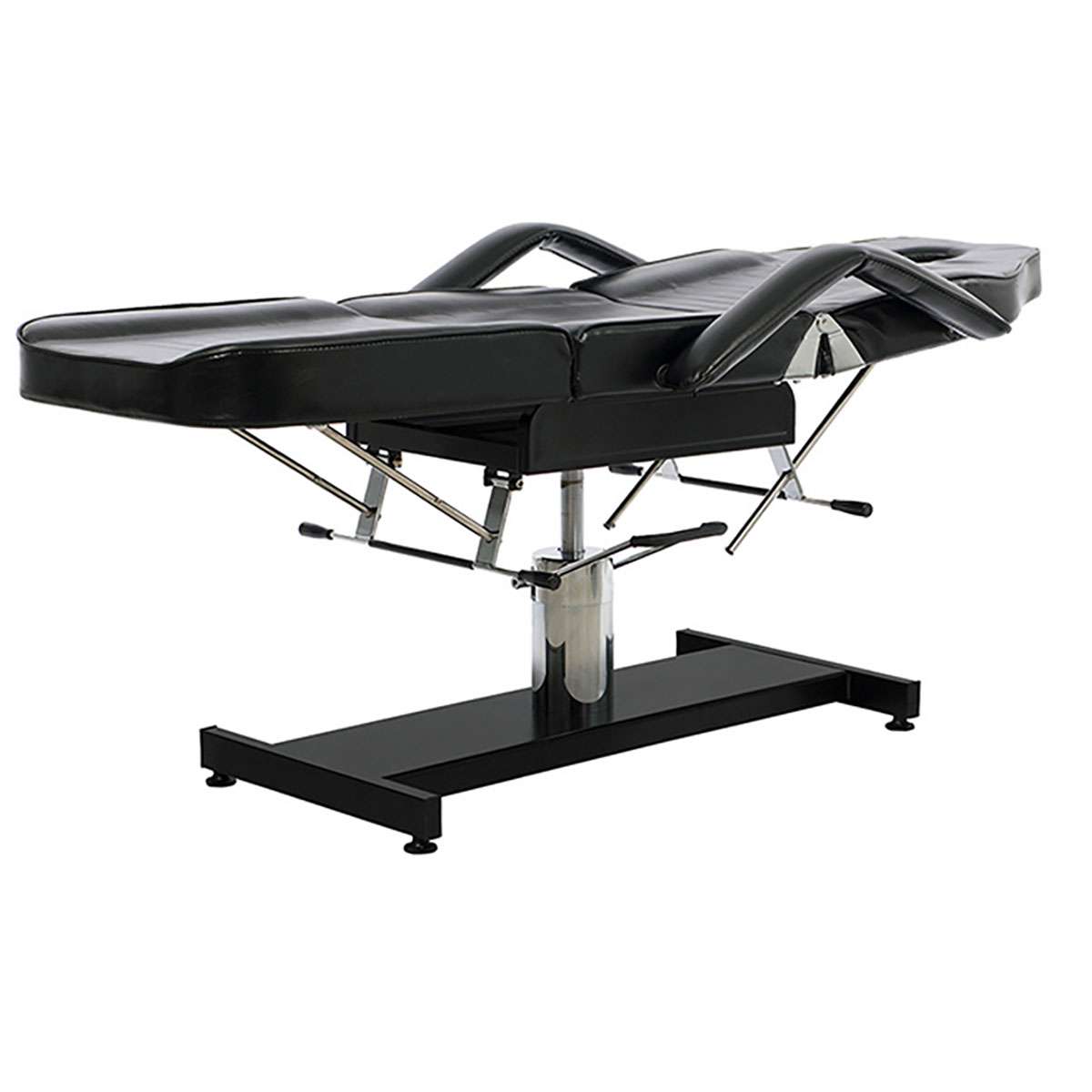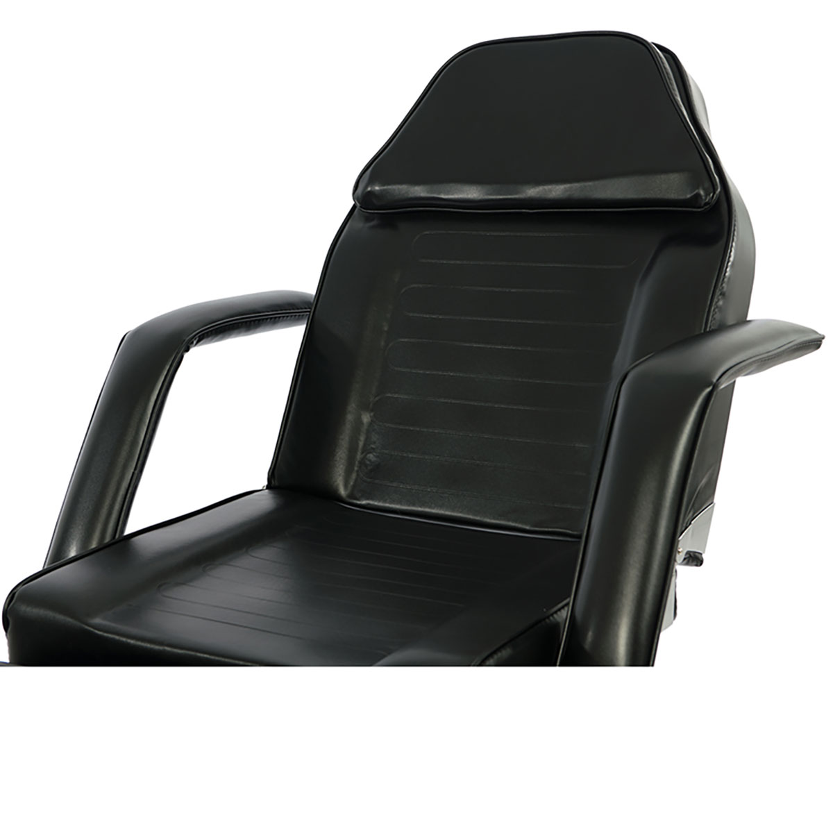 Fauteuil esthétique MENT BLACK à 3 plans, hauteur réglable par pompe hydraulique, l’inclinaison du dossier et des jambes manuelles. Trou pour le visage et accoudoirs amovibles. Porte-rouleau inclus.