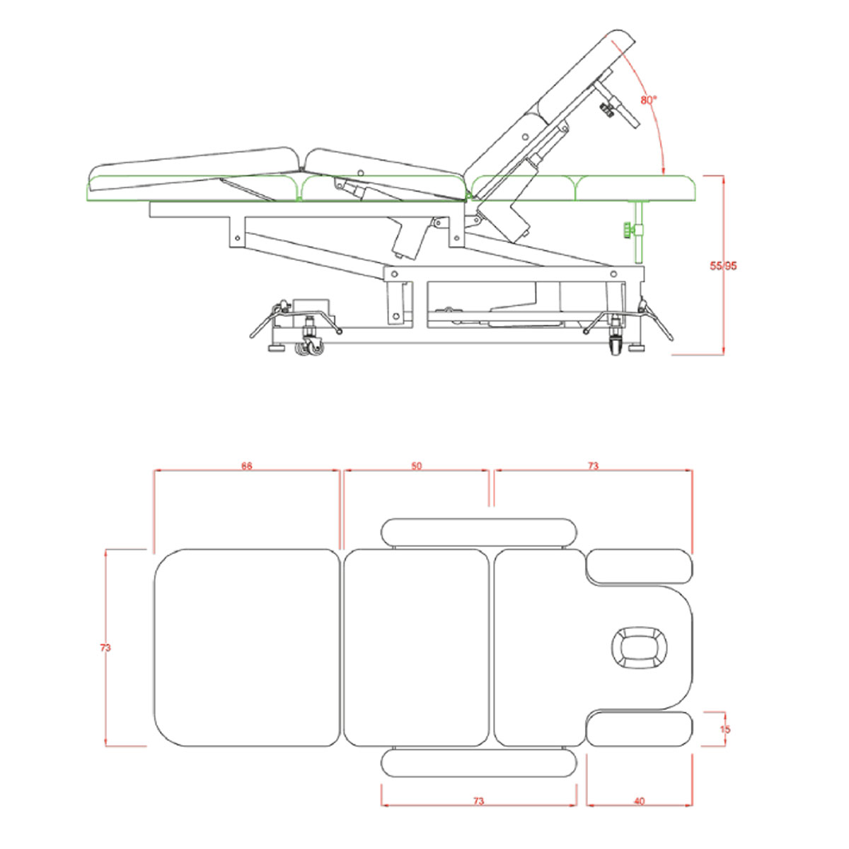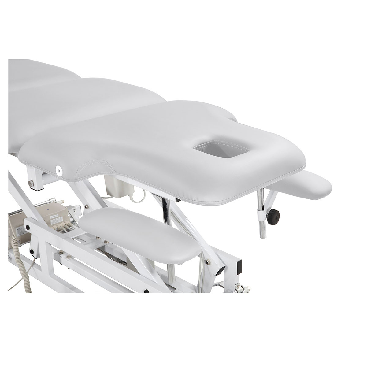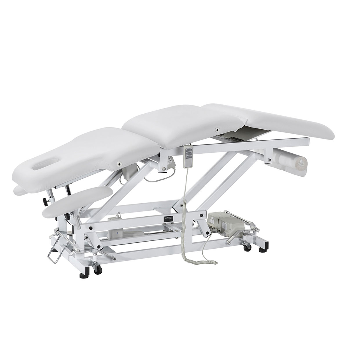 Table de physiothérapie ACRUM, équipé de 3 moteurs permettant différents réglages de position. Revêtements PU , 2 types d’accoudoirs fixe et latéraux réglables, dossier avec ouverture faciale, roulette avec frein et structure robuste.