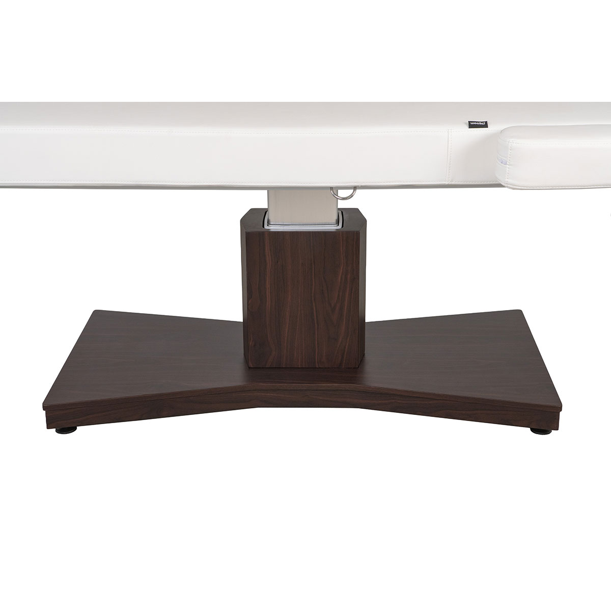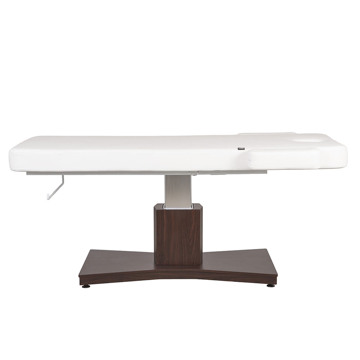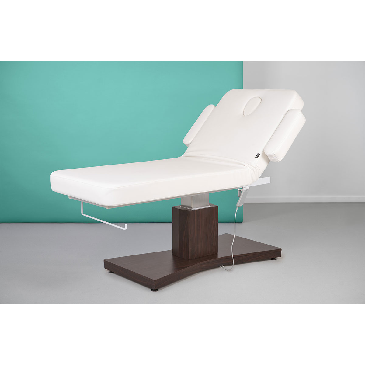 Table de massage GOID DARK, avec base en bois, réglage motorisé de la hauteur et dossier inclinable par vérin à gaz. Coussin cervical avec trou facial, accoudoirs amovibles et porte rouleau intégré,