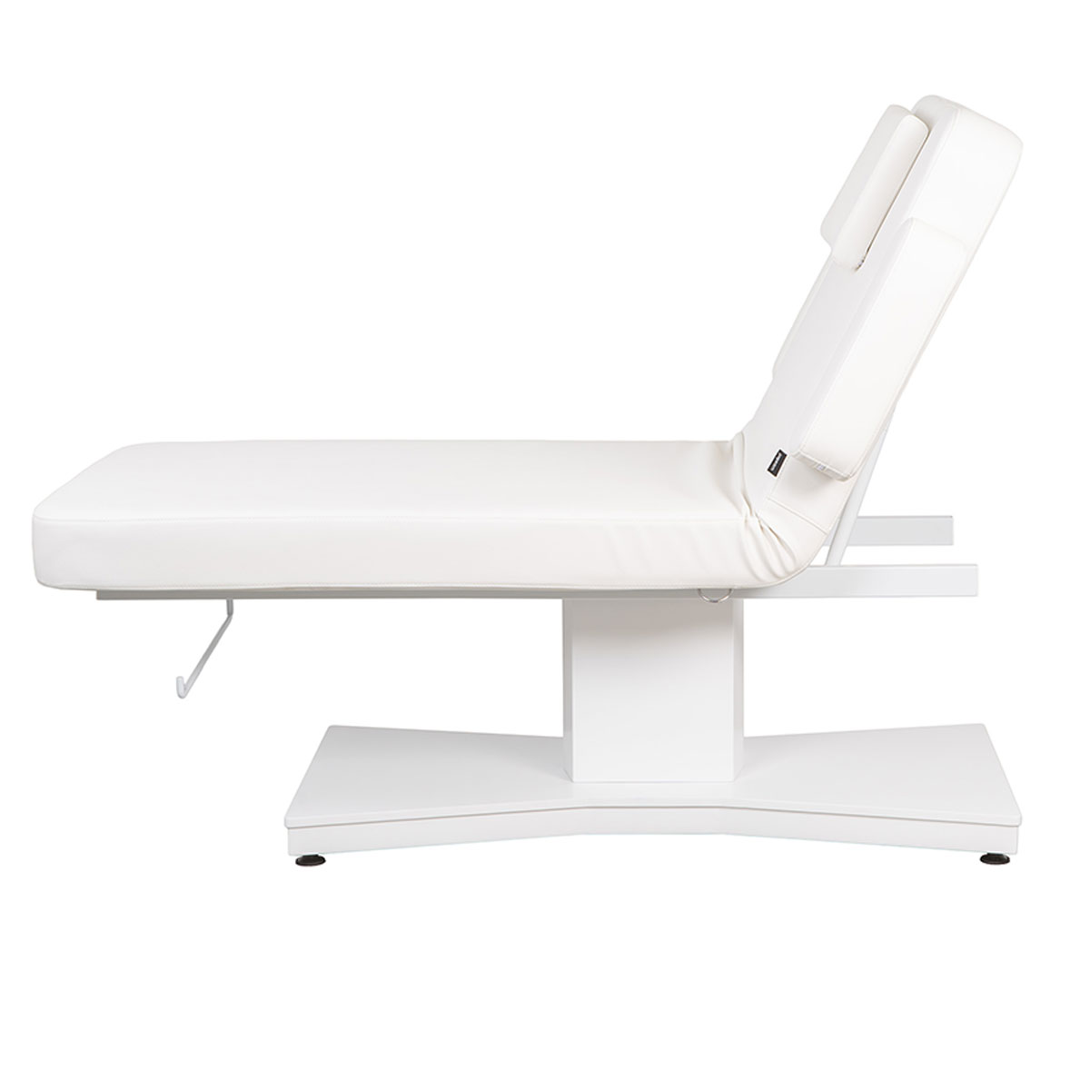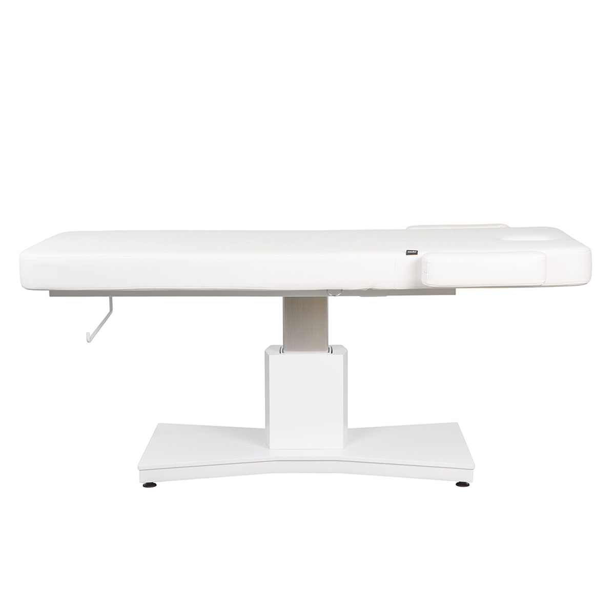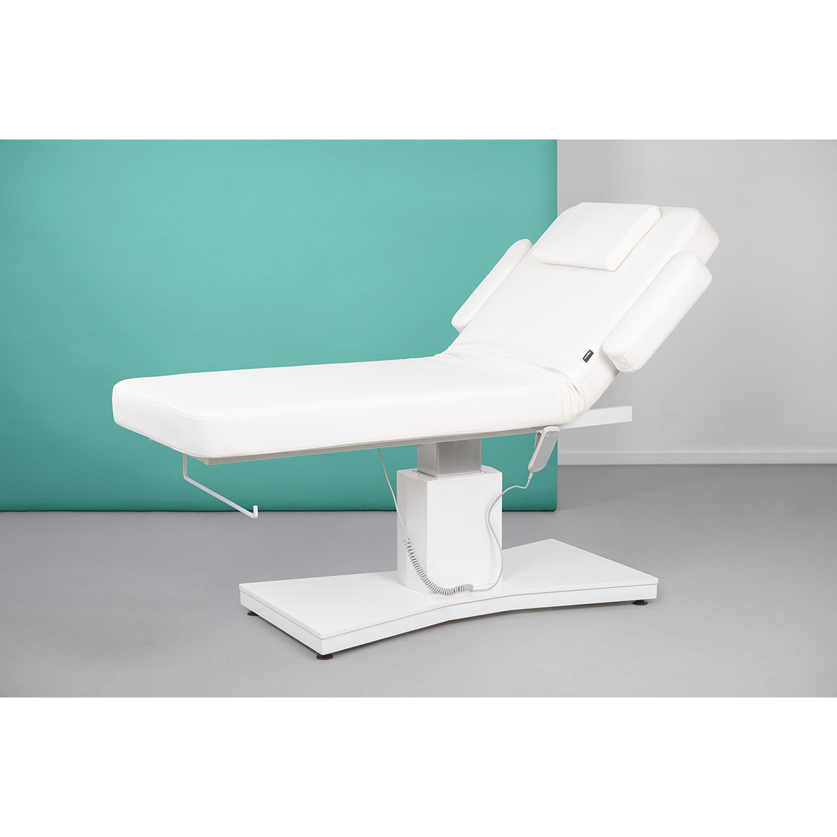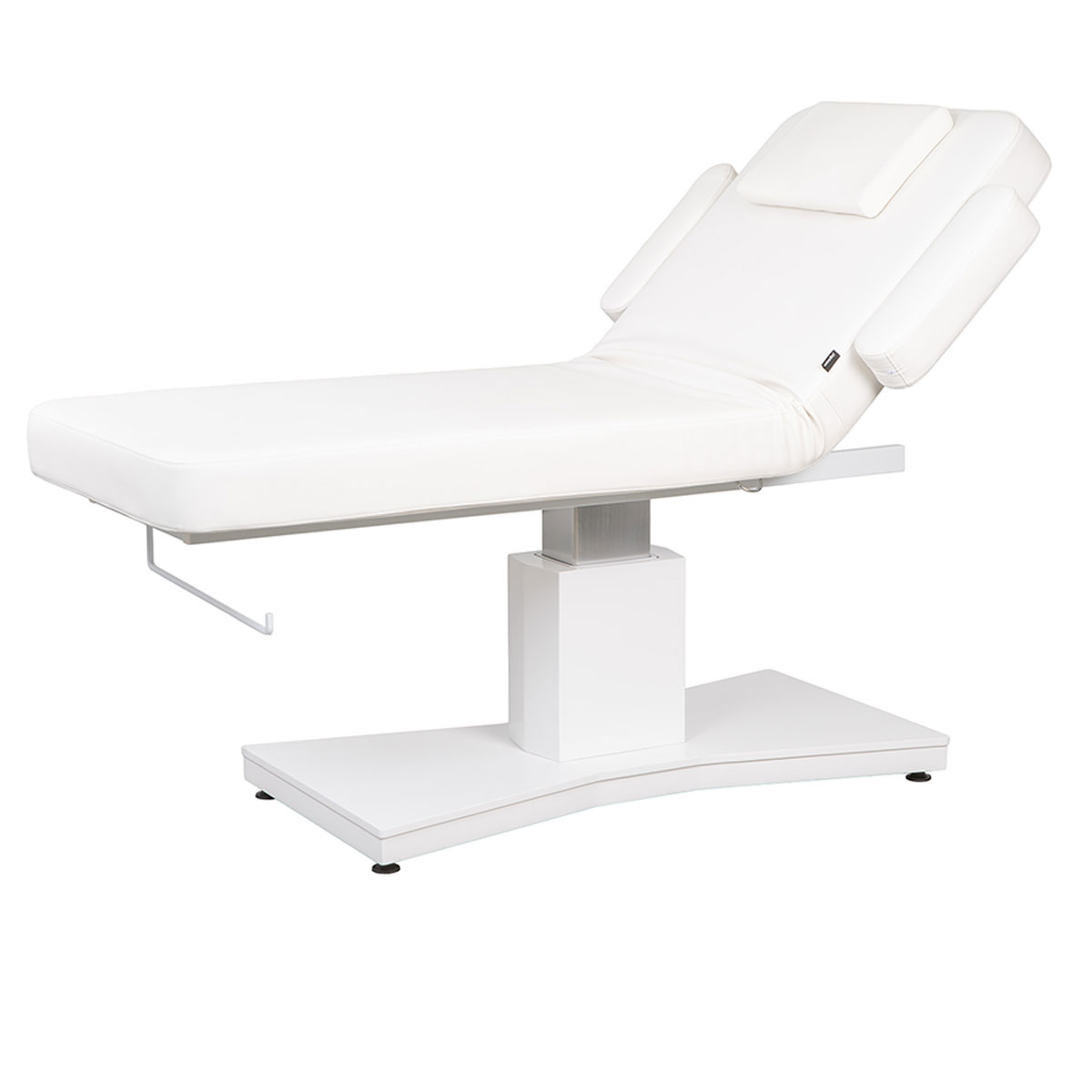 Table de massage GOID WHITE, multifonction réglage motorisé de la hauteur et dossier ajustable par vérin à gaz. Coussin cervical avec ouverture faciale, accoudoirs amovibles et porte rouleau intégré
