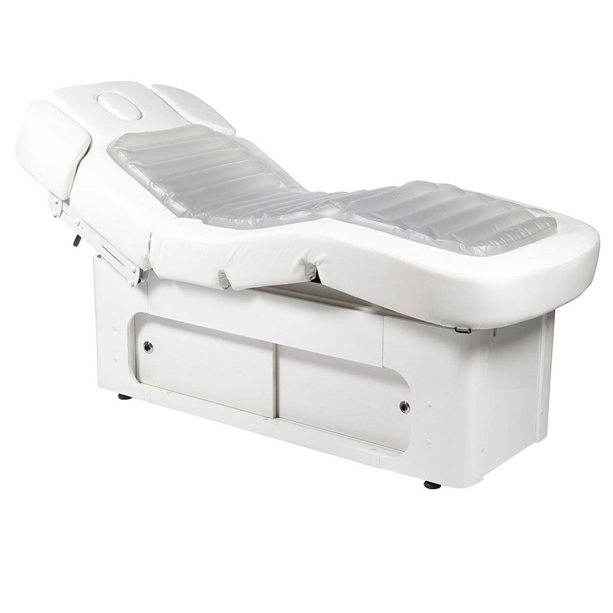 Table massage électrique KELLA, table de luxe en bois blanc équipé d’un matelas en PU. Table équipée de LED colorés. La table dispose de coussins d’eau, d’un trou visage, d’accoudoirs amovibles et d’un chauffage pour le confort de vos clients.