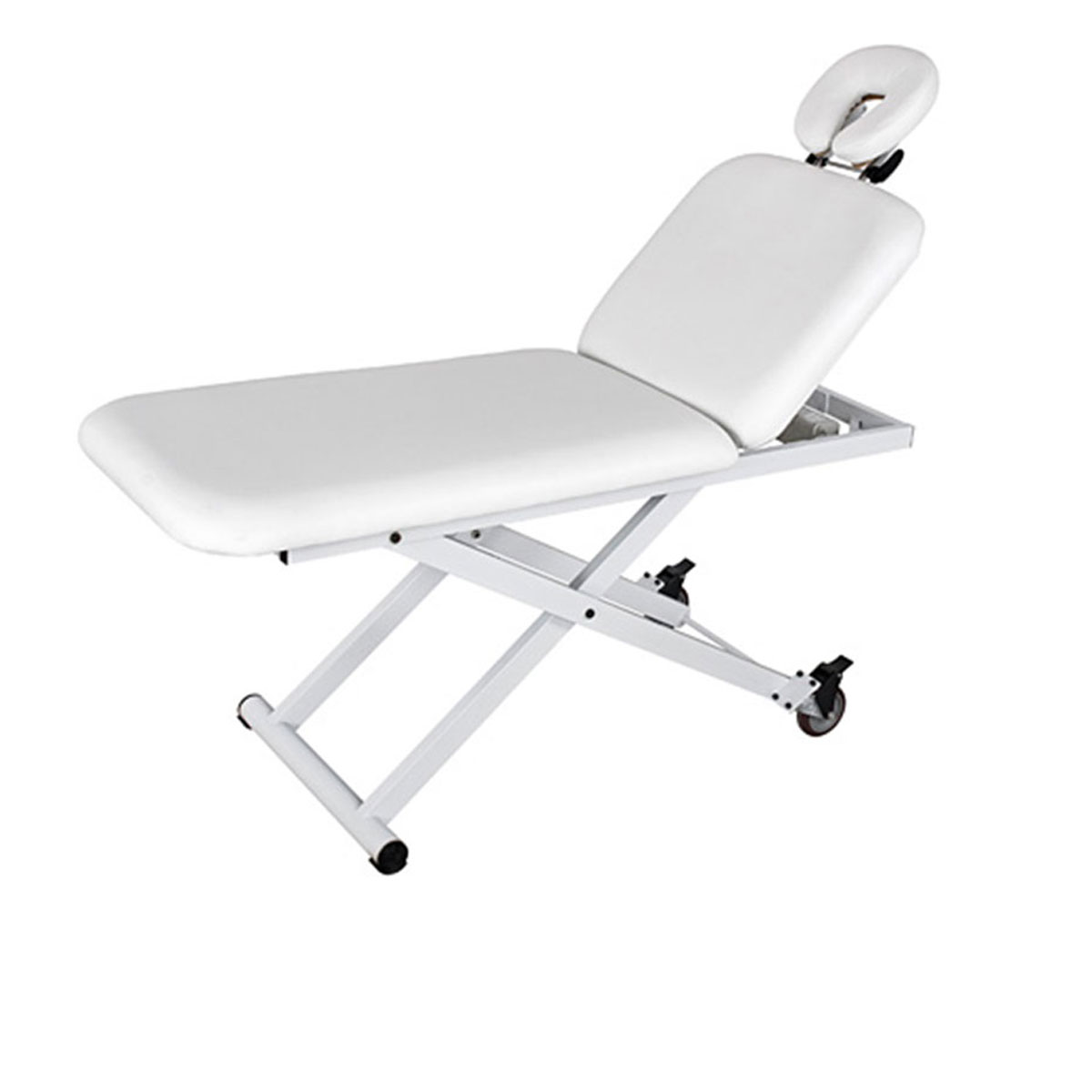 Table de massage électrique LATIS, conçu avec un matelas à 2 plans en PU blanc sur une structure métallique robuste, équipé de 2 roues pour un déplacement facile, d’une têtière réglable et amovible pour garantir une prestation de qualité à vos clients.