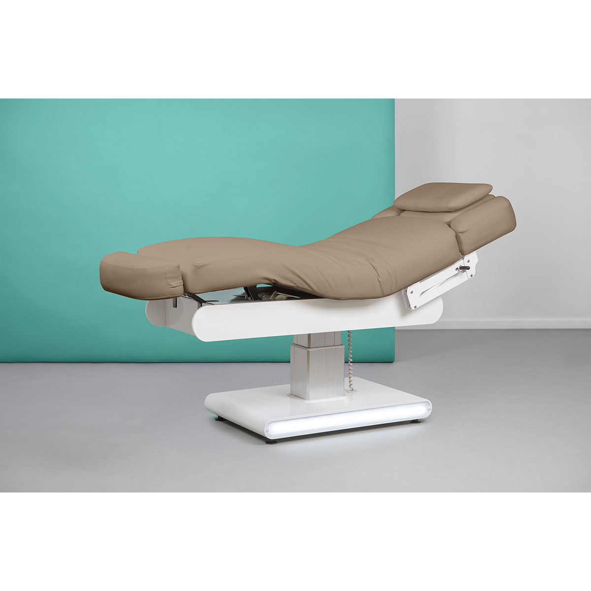 La base avec éclairage LED intégré, proposant plusieurs teintes lumineuses, permet de personnaliser l’ambiance de la cabine selon le type de soin ou l’identité du centre, apportant une dimension sensorielle supplémentaire à l’expérience client.
