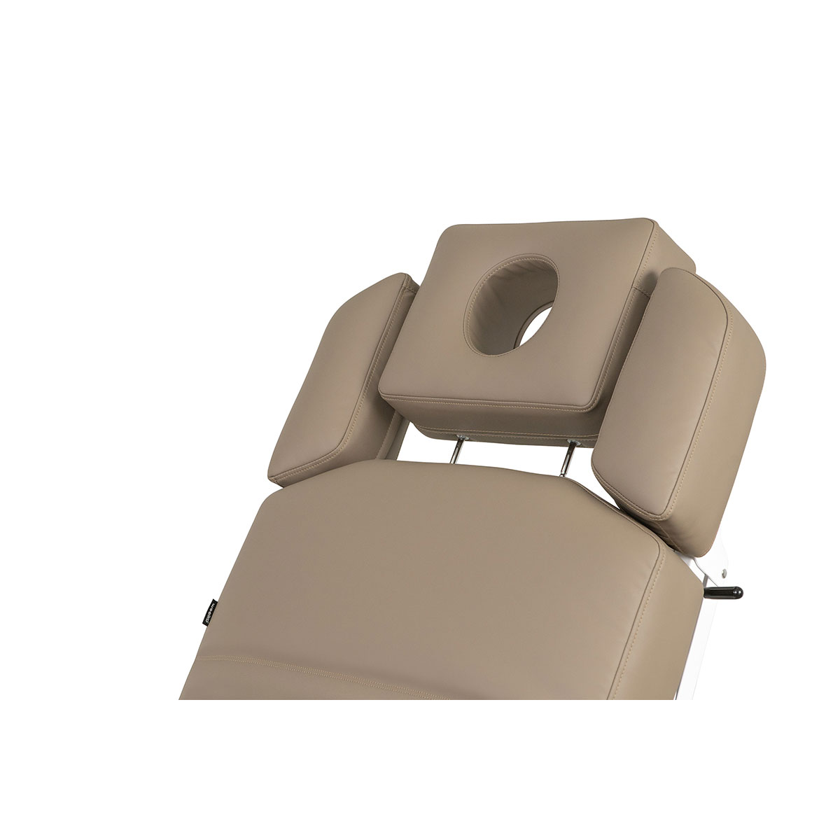 La table est équipée d’accoudoirs ajustables facilitant l’installation du client et d’une têtière ergonomique avec ouverture faciale, idéale pour les massages et soins réalisés en position allongée. Son revêtement en PU premium, doux au toucher, se distingue par sa résistance à l’usure, ses propriétés hygiéniques et sa facilité d’entretien, répondant parfaitement aux exigences d’un usage intensif en environnement professionnel.