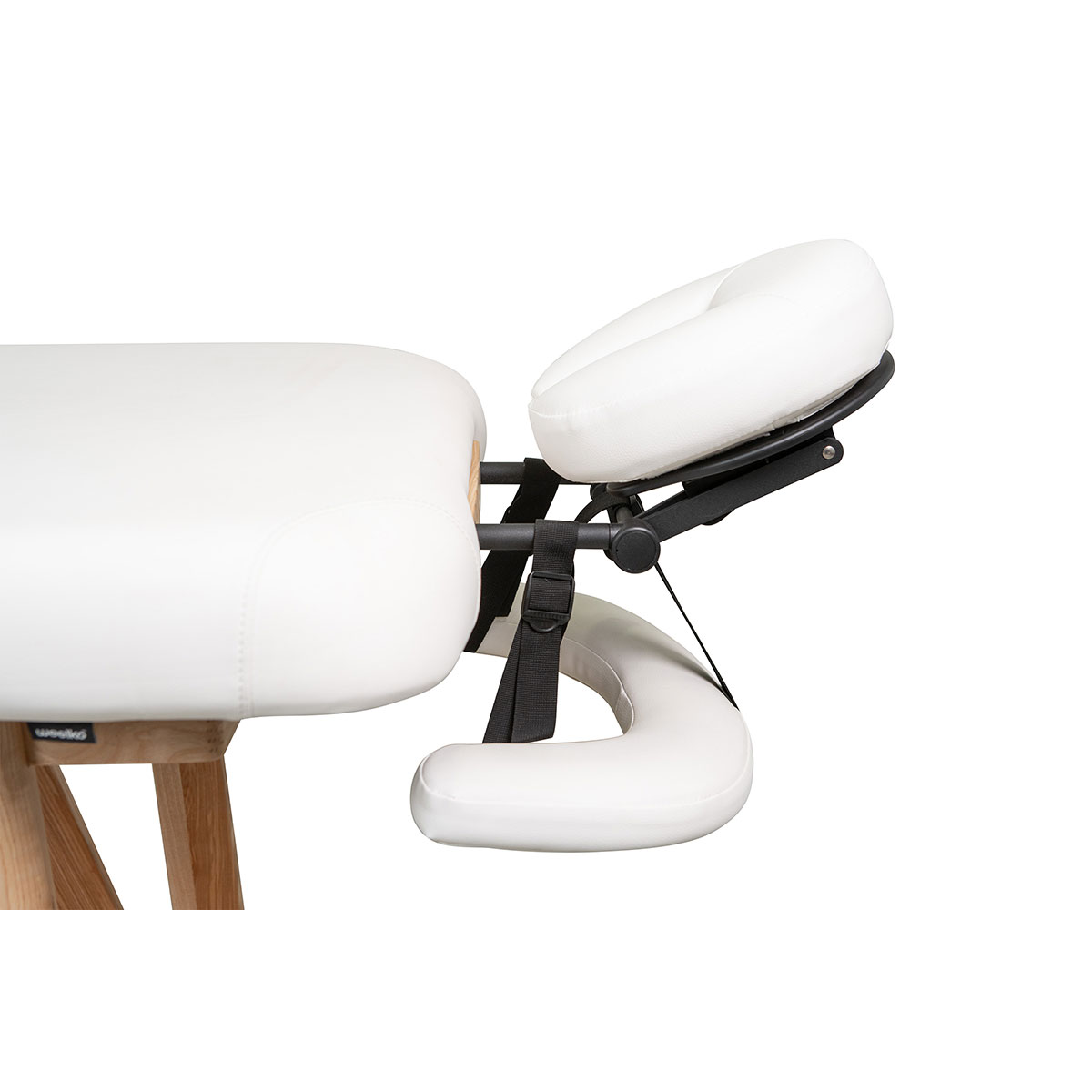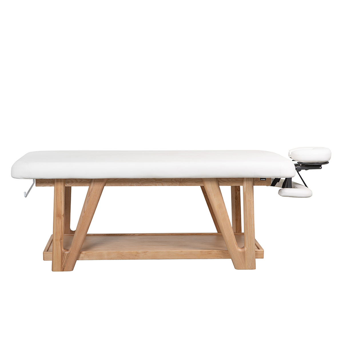 Table de massage ROOTS WHITE, structure fixe en bois massif, équipée d’un rangement inférieur et d’un support intégré. Confort assuré grâce au matelas épais 11 cm, à la têtière ajustable avec réglage avant/arrière et aux accoudoirs réglables. Revêtement en PU