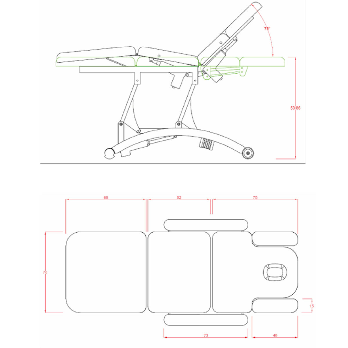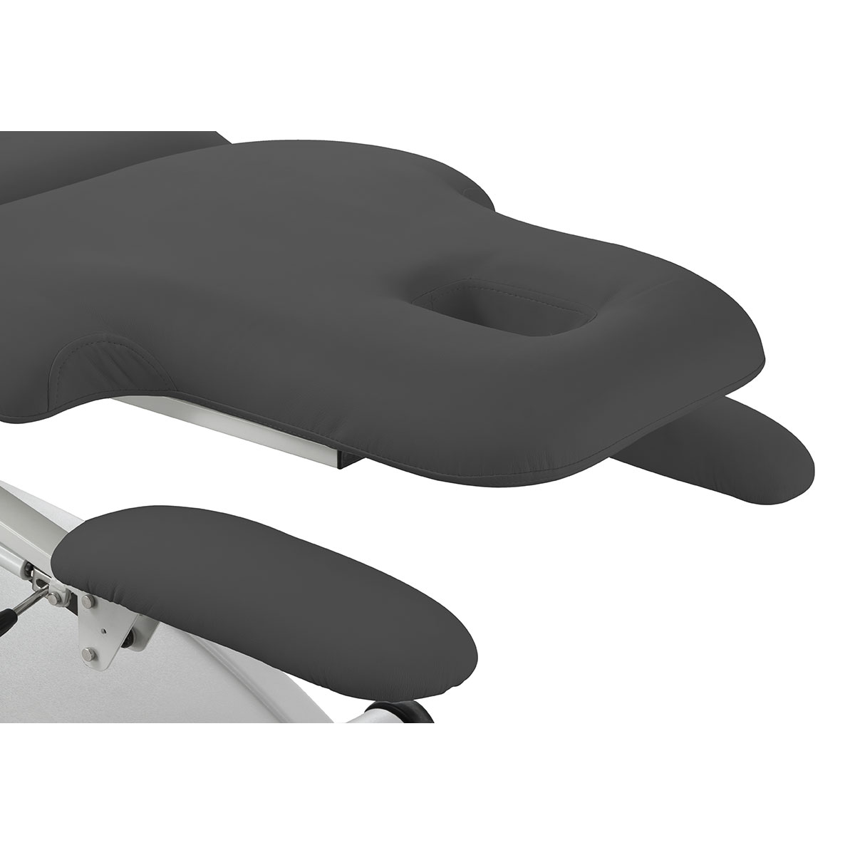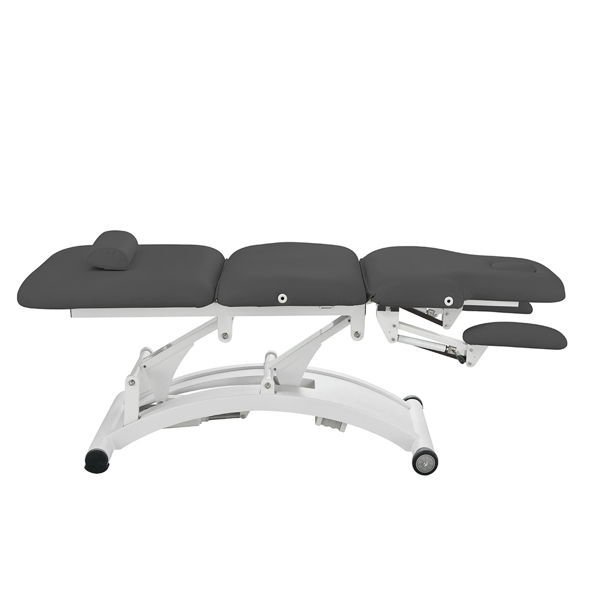 Table de physiothérapie SPHEN BLACK, dédiée à la physiothérapie, avec 3 réglages motorisés (hauteur, dossier, zone centrale), accoudoirs modulables, appui facial avec coussins et base semi sphérique mobile sur roue