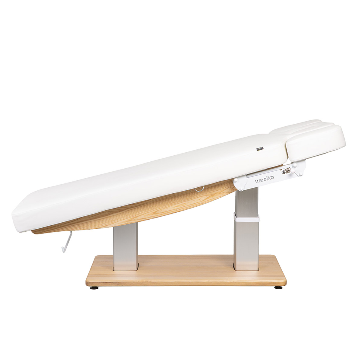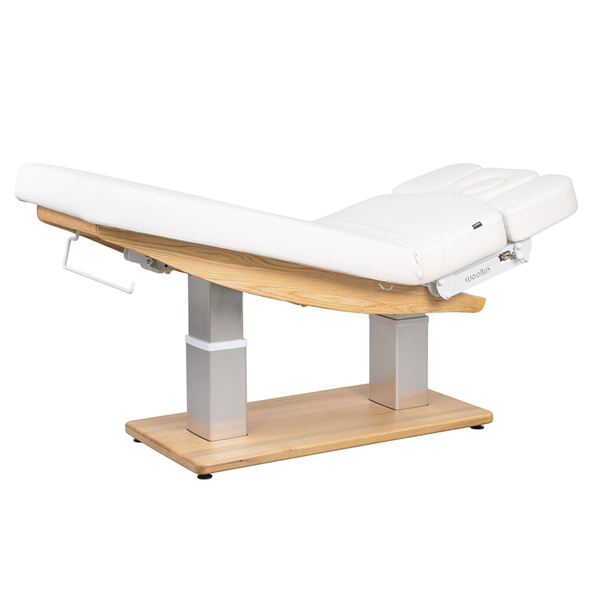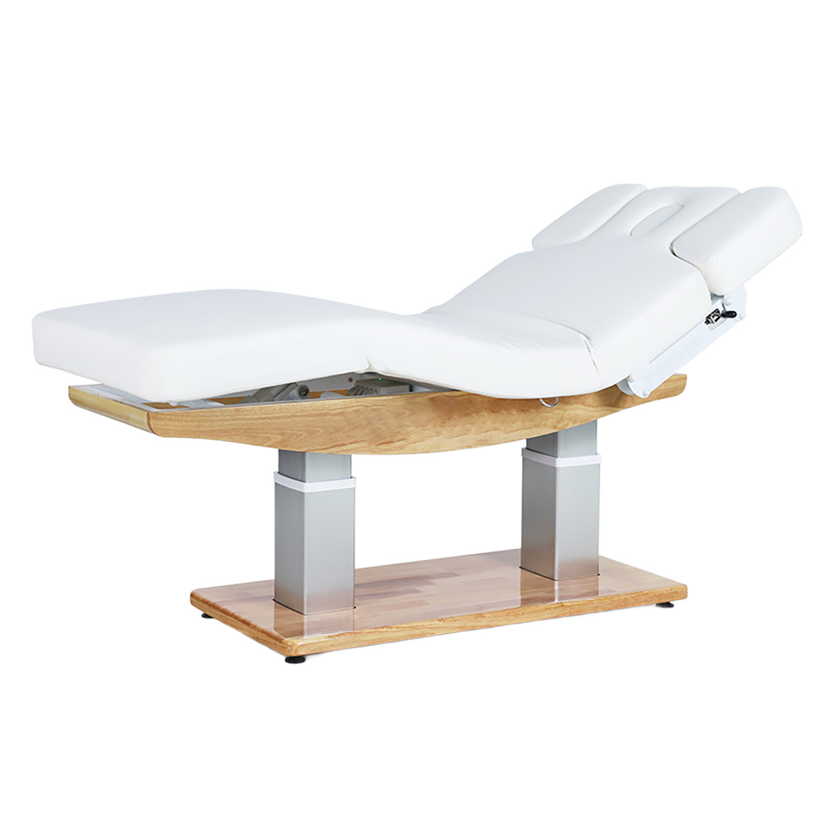 Table de massage TROCH SMART, 4 moteurs silencieux, réglages précis, matelas épais chauffant 3 sections, accoudoirs ajustables et têtière faciale. Base en bois naturel pour un design chaleureux, idéale pour spas et instituts de bien-être.