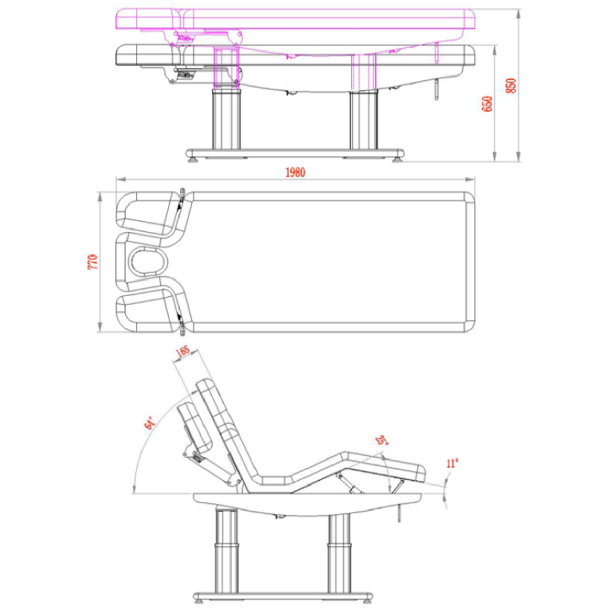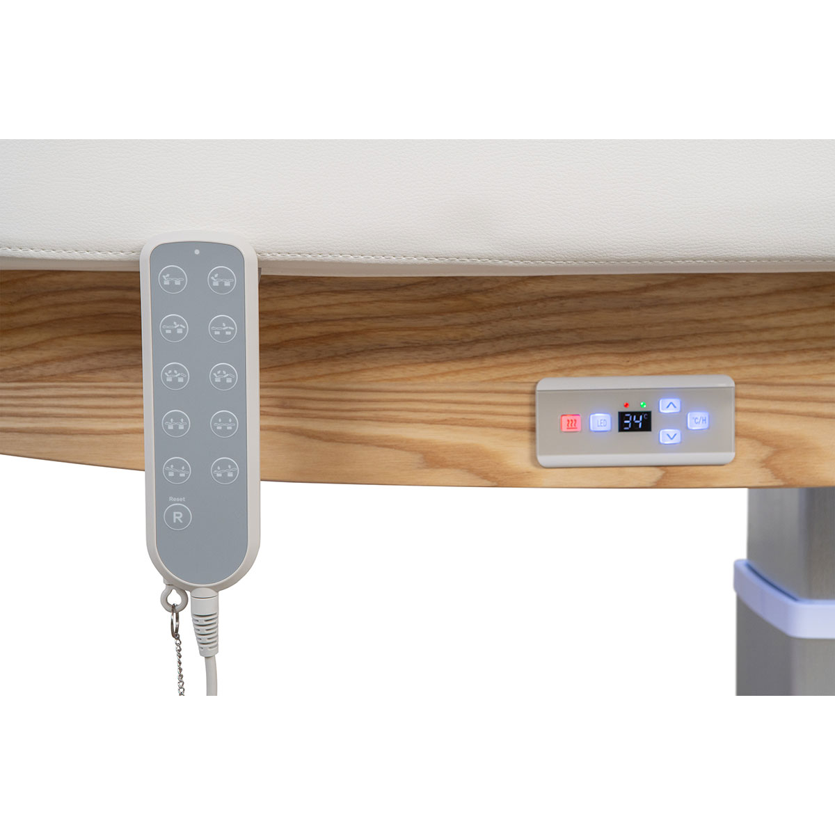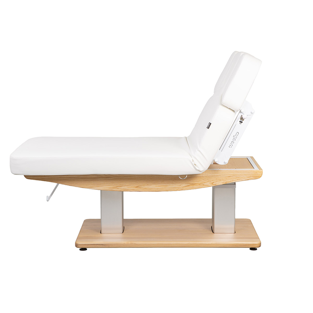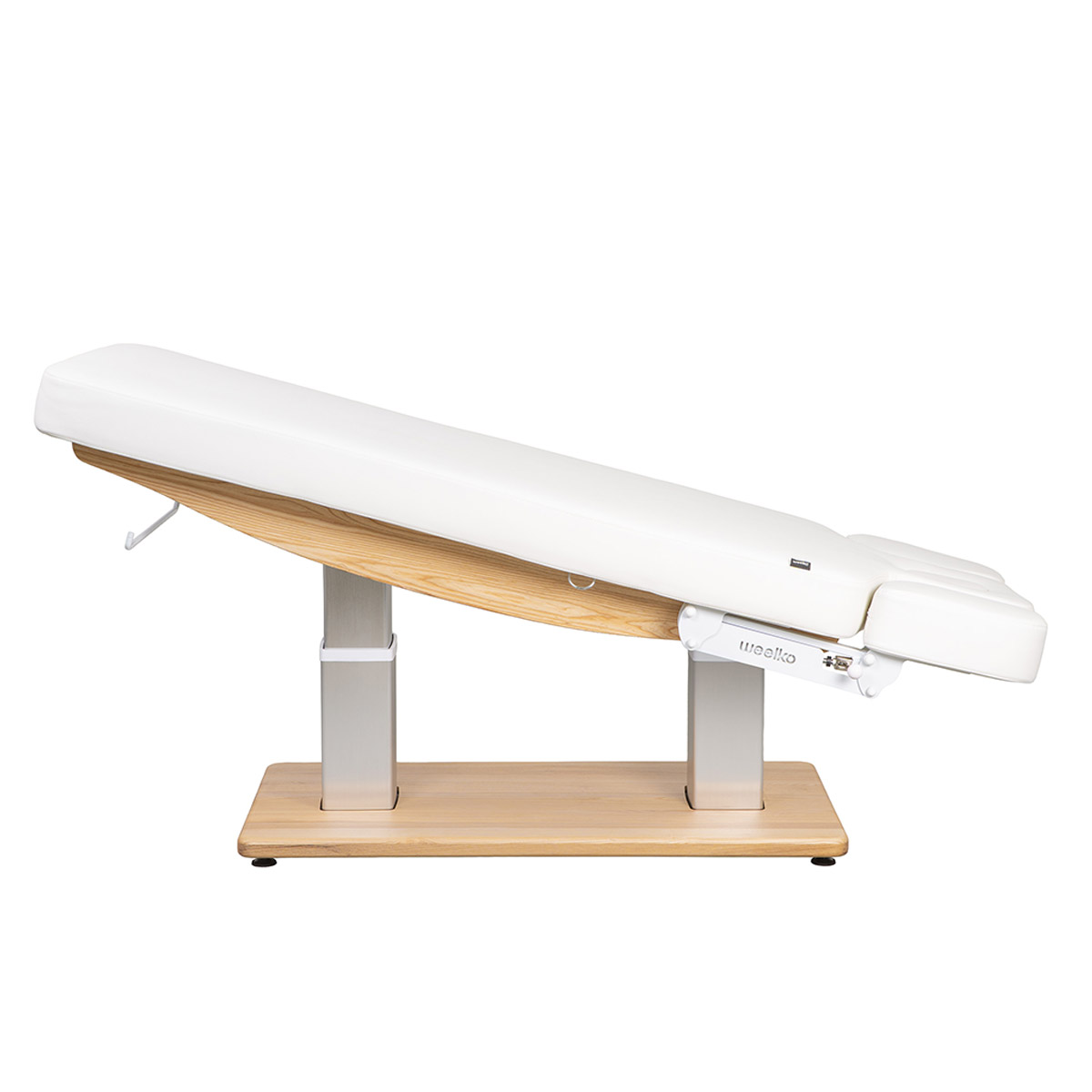 Table de massage TROCH SMART, 4 moteurs silencieux, réglages précis, matelas épais chauffant 3 sections, accoudoirs ajustables et têtière faciale. Base en bois naturel pour un design chaleureux, idéale pour spas et instituts de bien-être.