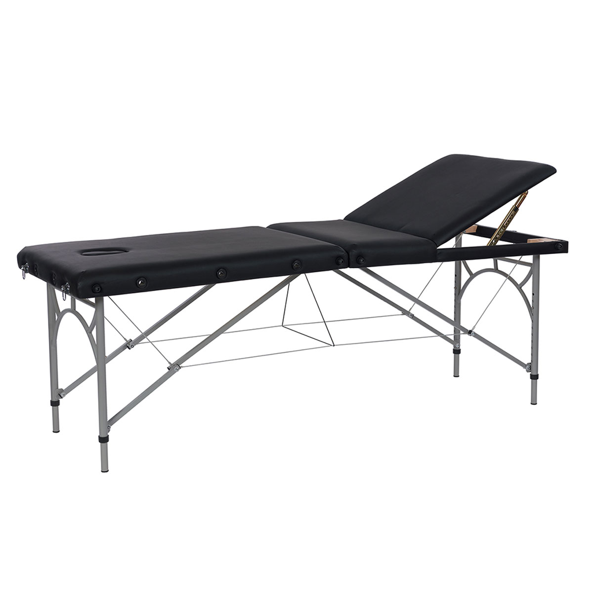 Table de massage portable VASTIS, 3 sections avec structure en aluminium légère et réglable par tendeurs. Hauteur réglable grâce à des positions fixes et pliage depuis chacune d’elles. Dossier réglable en