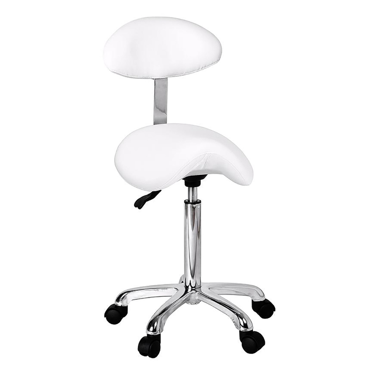 Tabouret ORGANIC PLUS W hauteur réglable (par vérin a gaz) – Base chromée avec 5 roues – assise en selle Pony avec dossier – revêtement en PU de haute qualité couleur blanc.