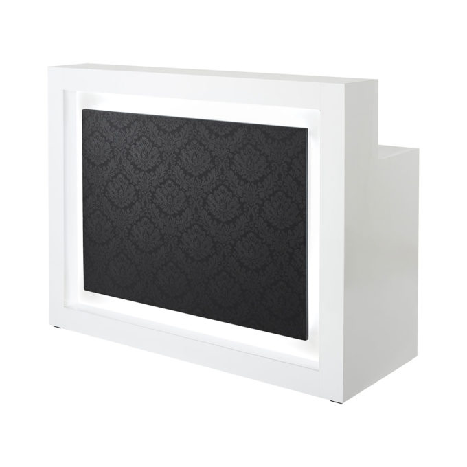Réception caisse LUZ avec structure en stratifié, partie frontale en sky et illumination intégrée.