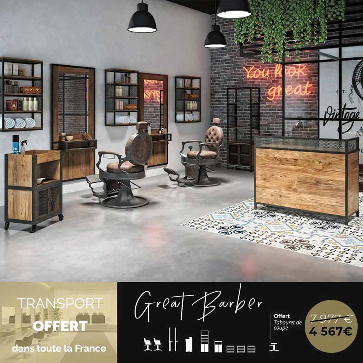 Le salon GREAT BARBER, un style industriel avec ses meubles en bois et métal mate noir et rétro avec ses fauteuils de barbier ornementés de détails raffinés.