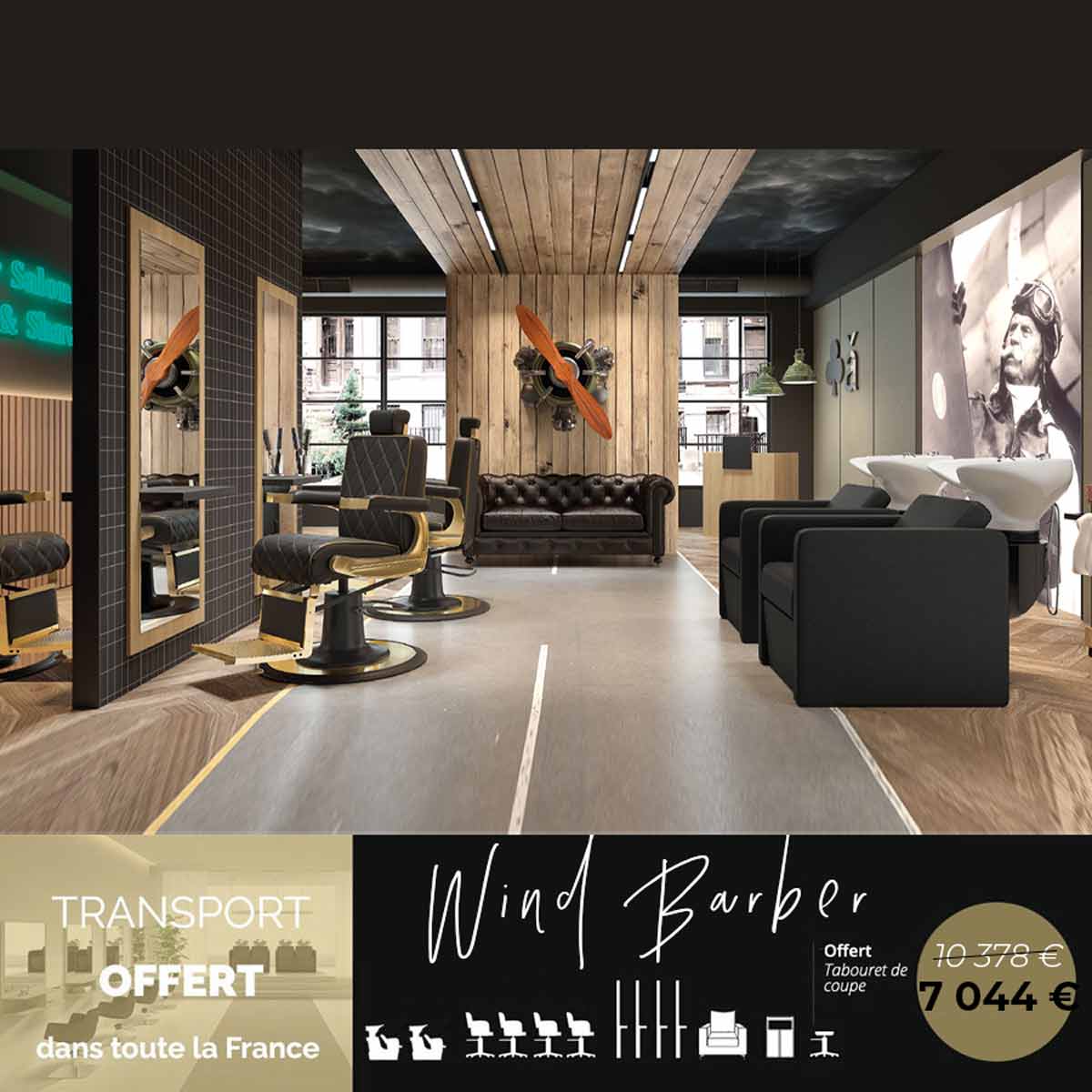 Le salon barbier WIND BARBER dégage une ambiance industrielle chic et masculine, mêlant bois brut, métal noir et touches vintage. L’atmosphère est à la fois élégante, chaleureuse et premium, avec un esprit barber shop contemporain pensé pour le confort et l’expérience client.